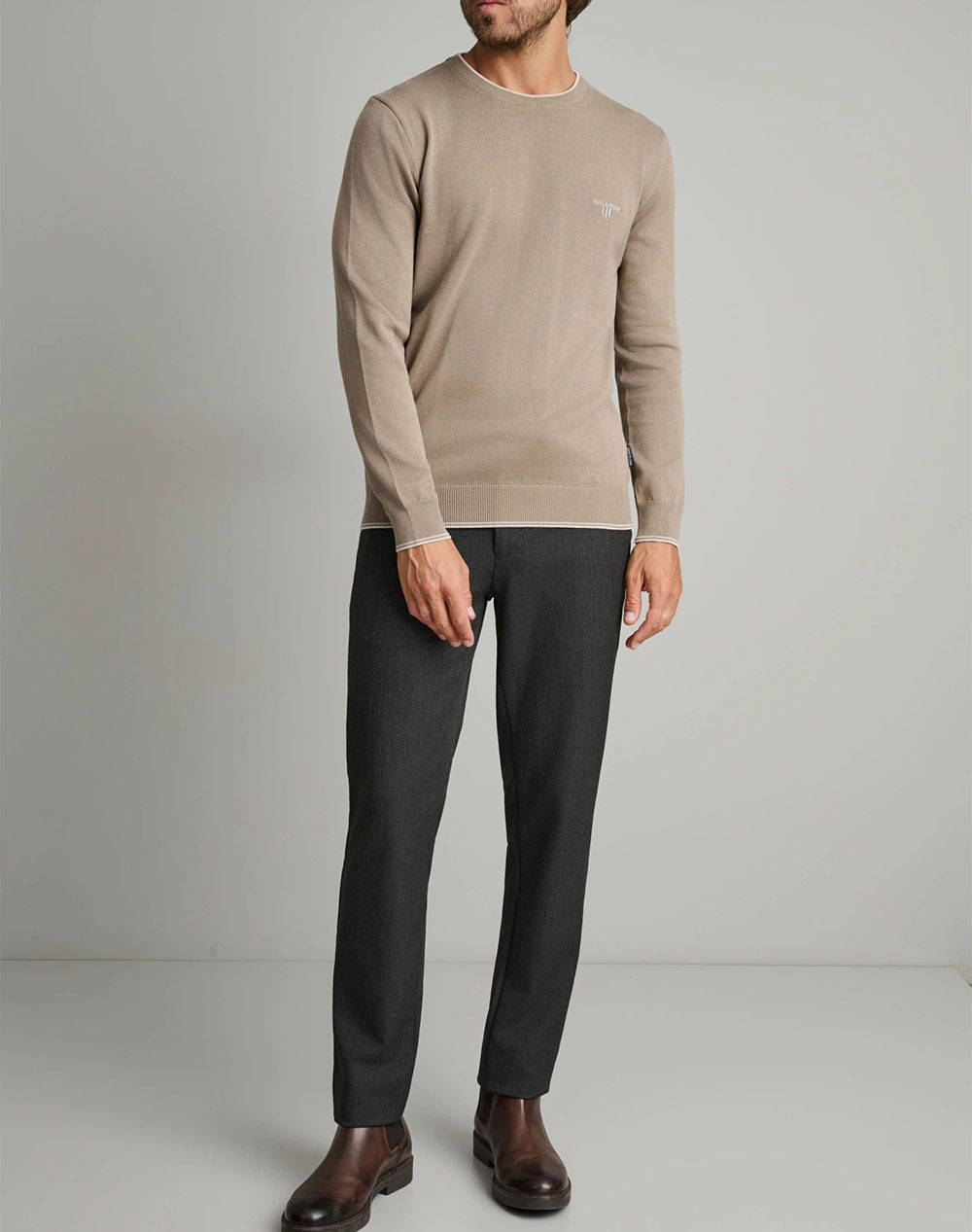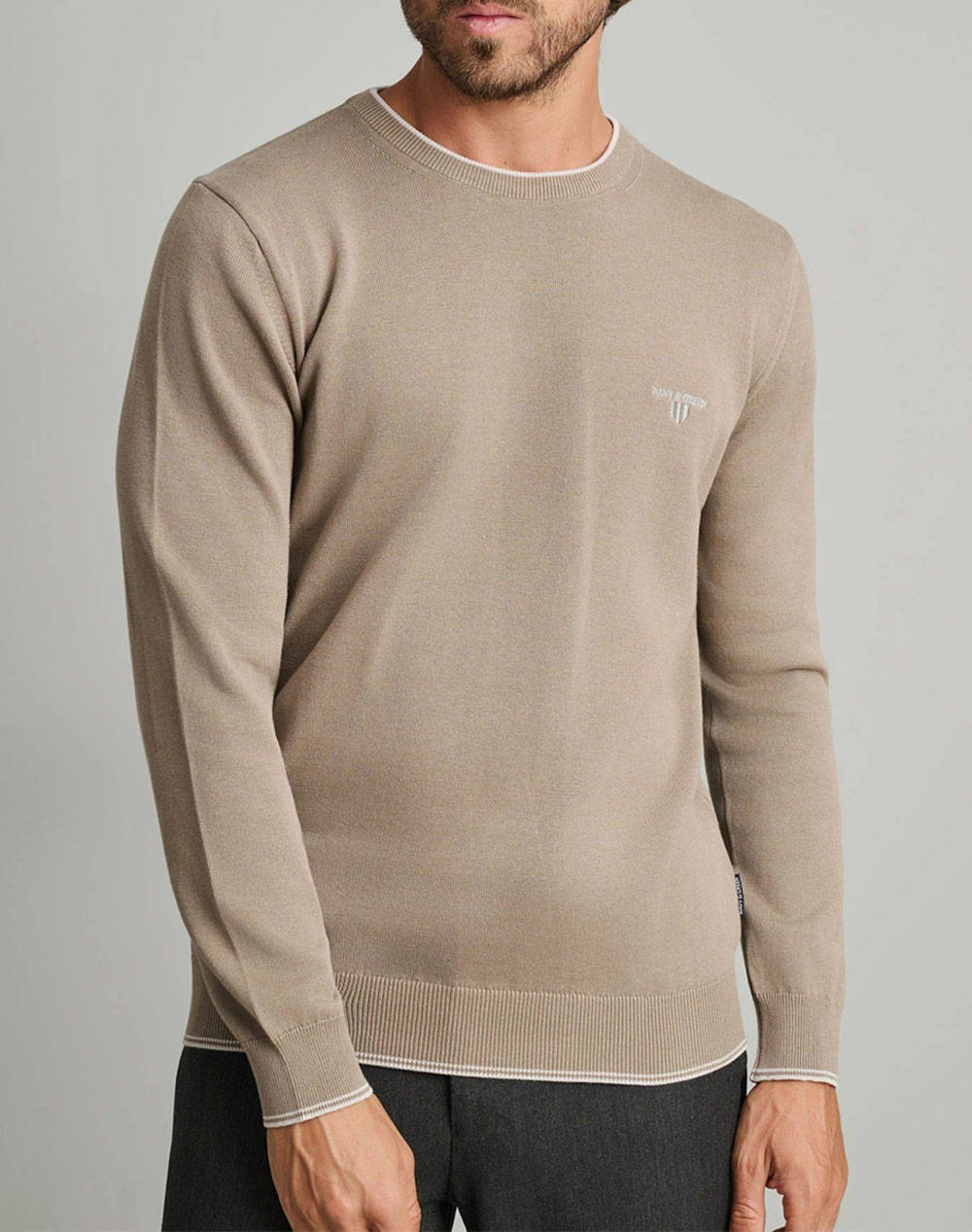 Ανδρική πλεκτή μπλούζα, σε κανονική γραμμή, μονόχρωμη, μακρυμάνικη, με στρογγυλή λαιμόκοψη με contrast λεπτομέρεια και λογότυπο στο στήθος.(Σύνθεση: 100% Βαμβάκι)