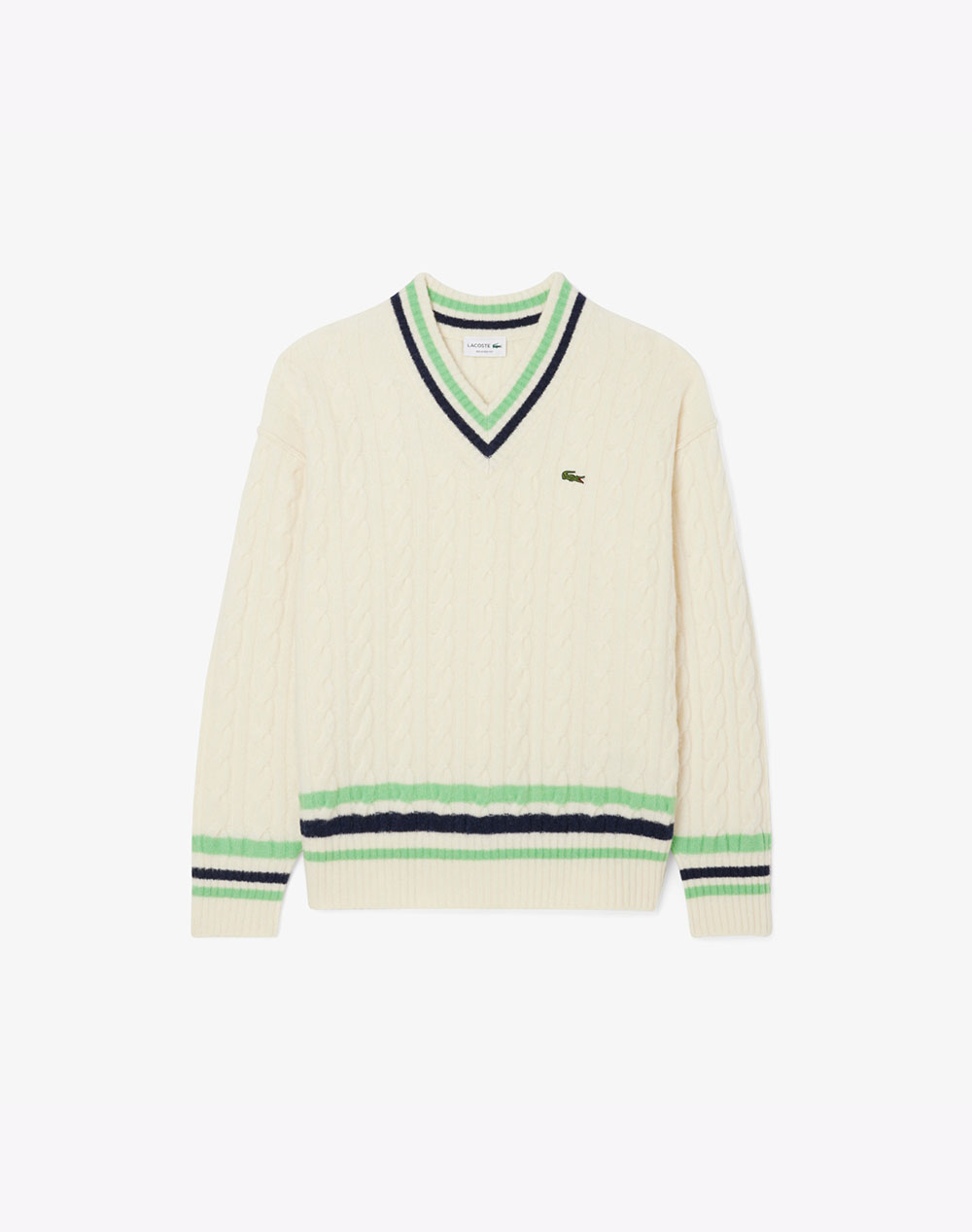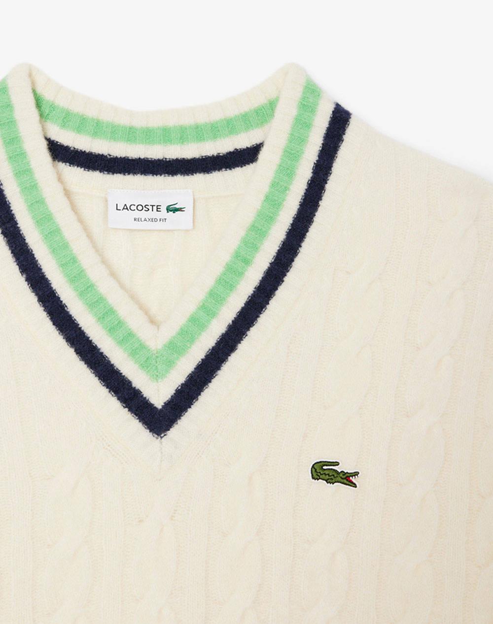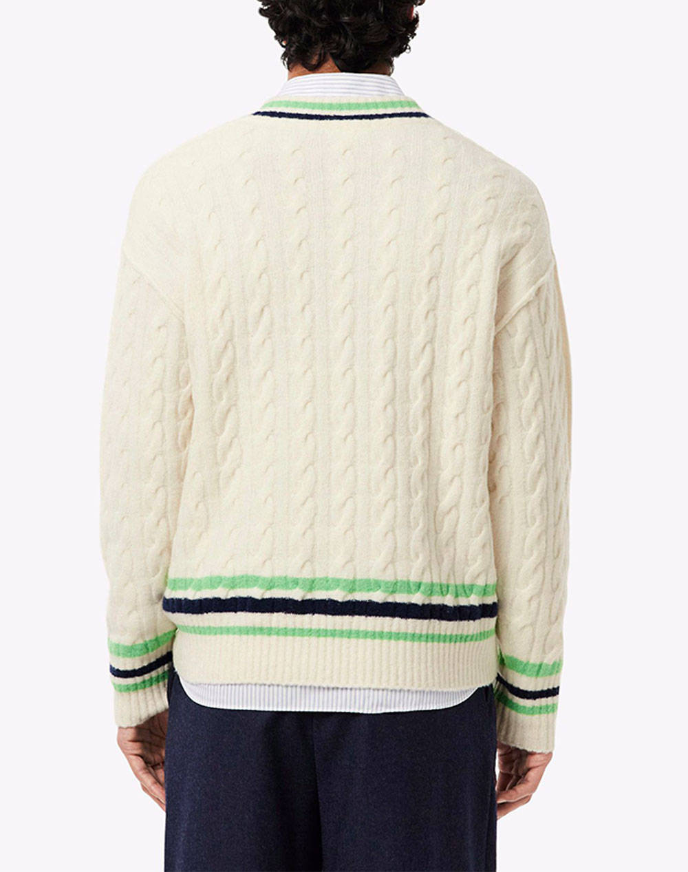 Ανδρικό πουλόβερ, σε χαλαρή γραμμή, με "V" λαιμόκοψη, ρίγες σε αντίθεση και σχέδιο πλεξούδα. (Σύνθεση: 80% Μαλλί, 18% Πολυαμίδιο, 2% Ελαστάνη)