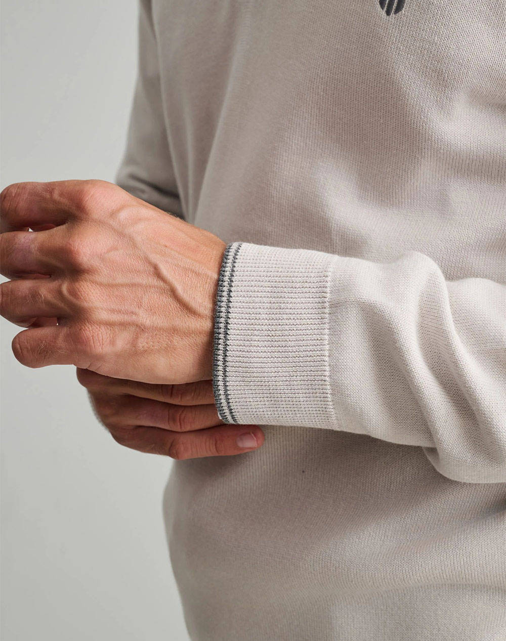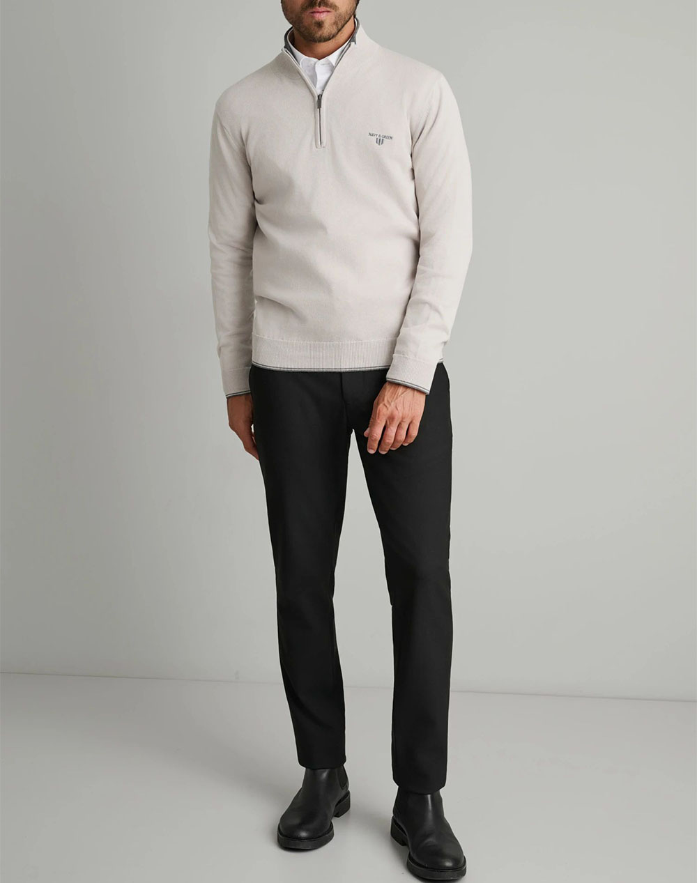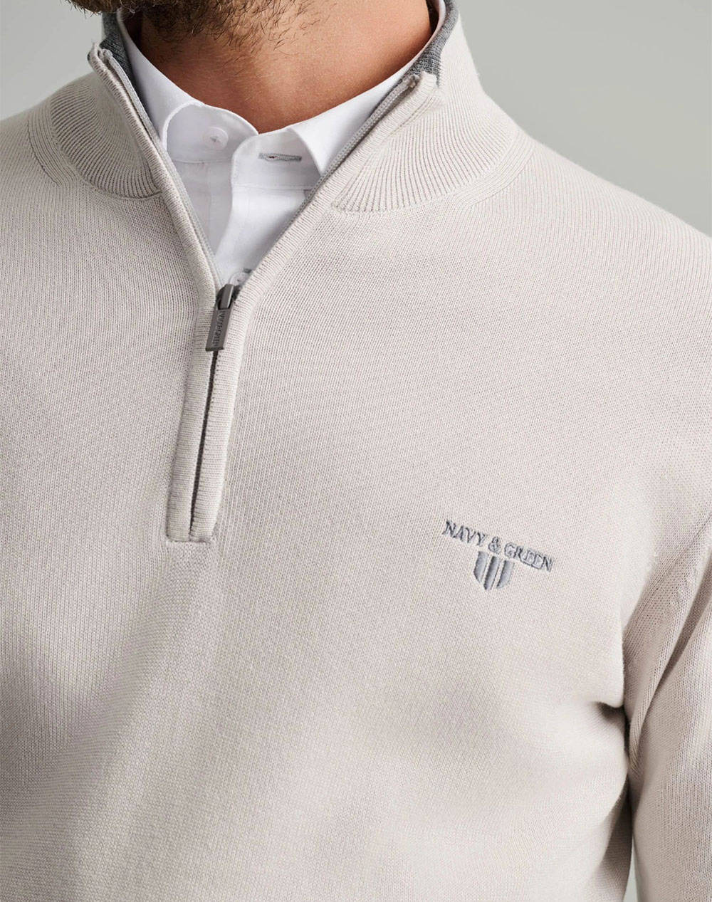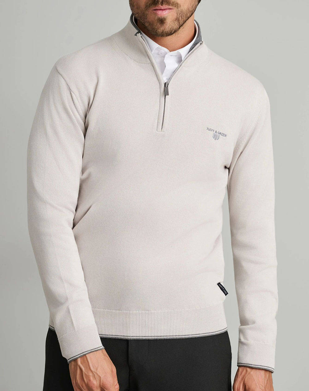 Ανδρική πλεκτή μπλούζα, σε κανονική γραμμή, μονόχρωμη, μακρυμάνικη, με ψηλή λαιμόκοψη με zip και contrast χρώμα εσωτερικά του γιακά.(Σύνθεση: 100% Βαμβάκι)
