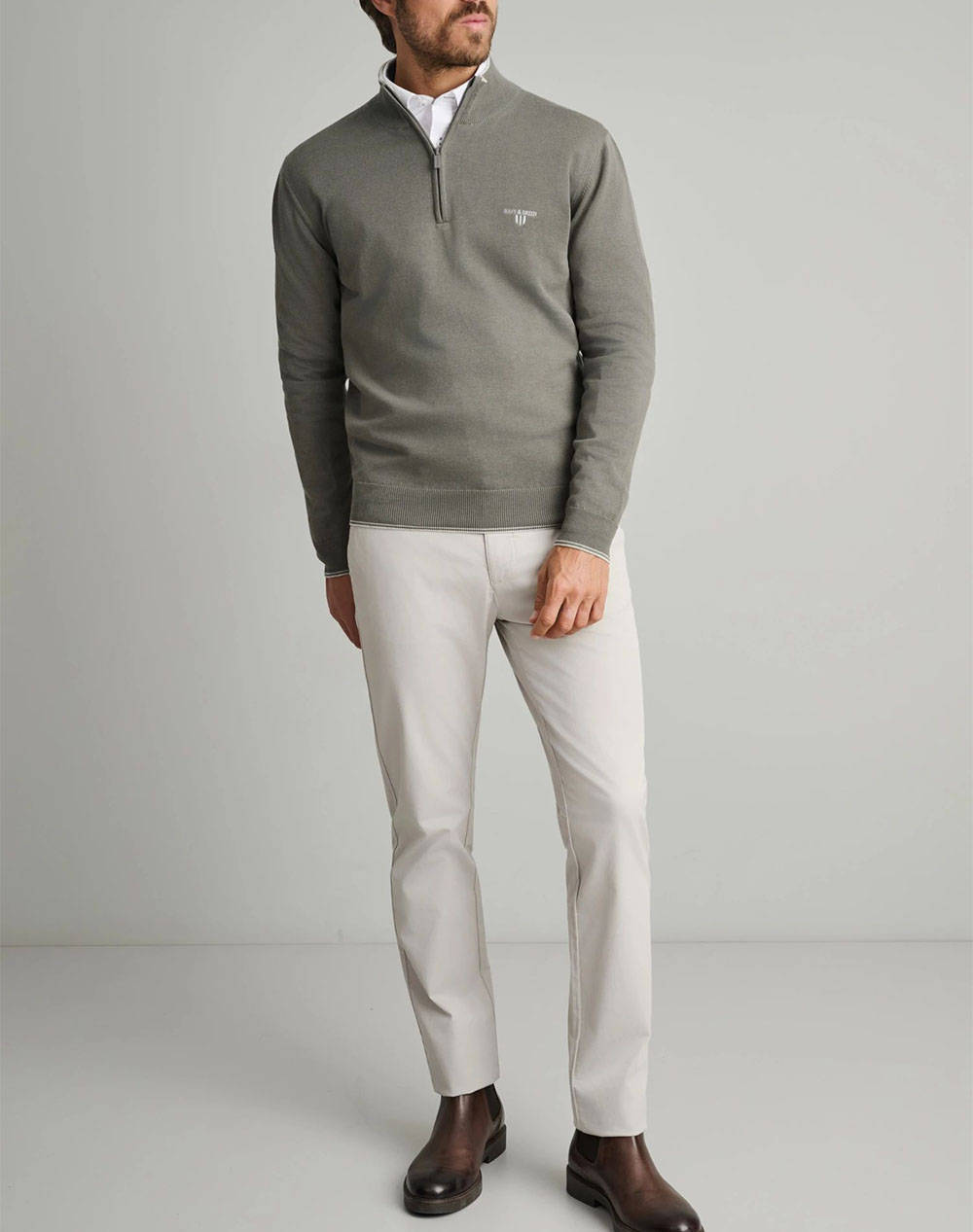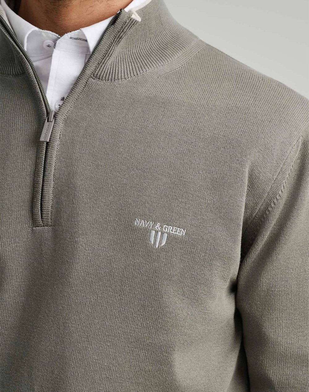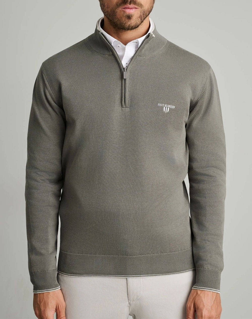 Ανδρική πλεκτή μπλούζα, σε κανονική γραμμή, μονόχρωμη, μακρυμάνικη, με ψηλή λαιμόκοψη με zip και contrast χρώμα εσωτερικά του γιακά.(Σύνθεση: 100% Βαμβάκι)