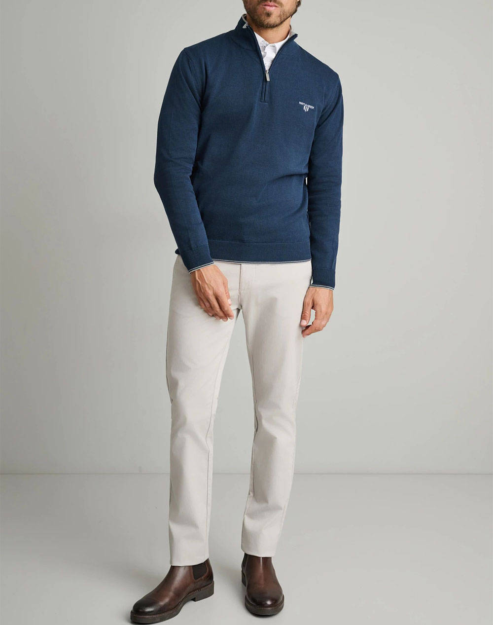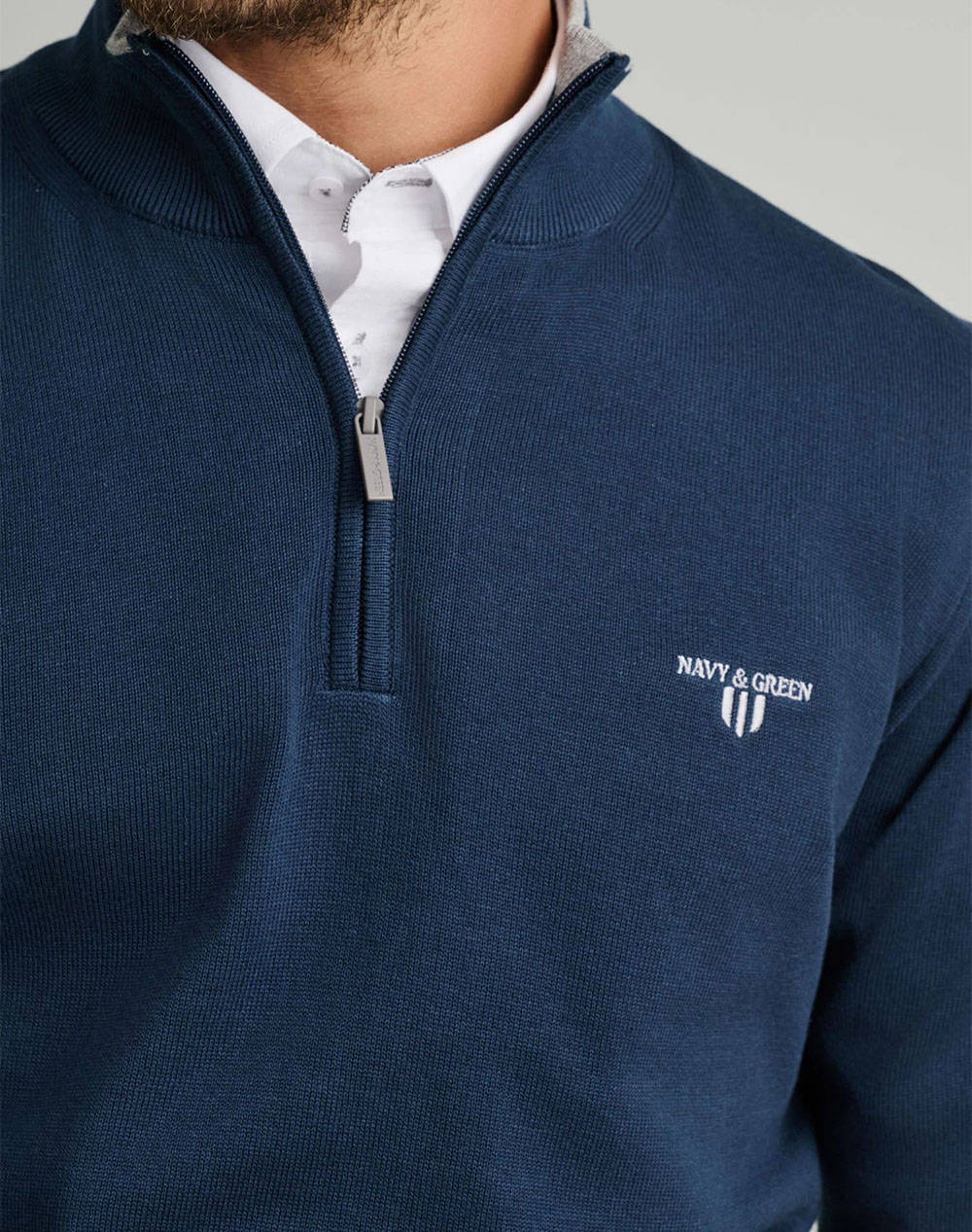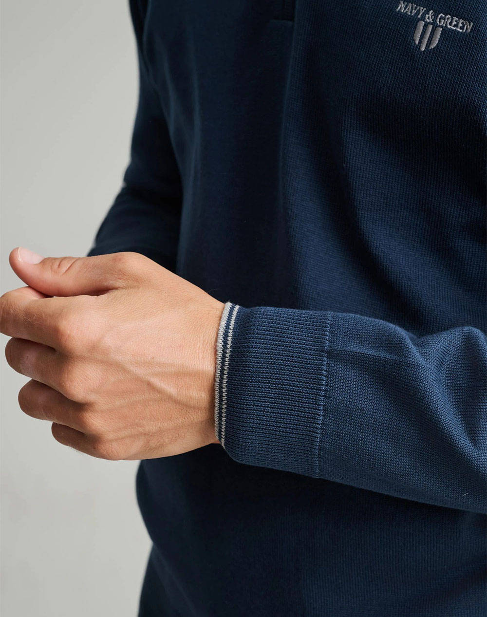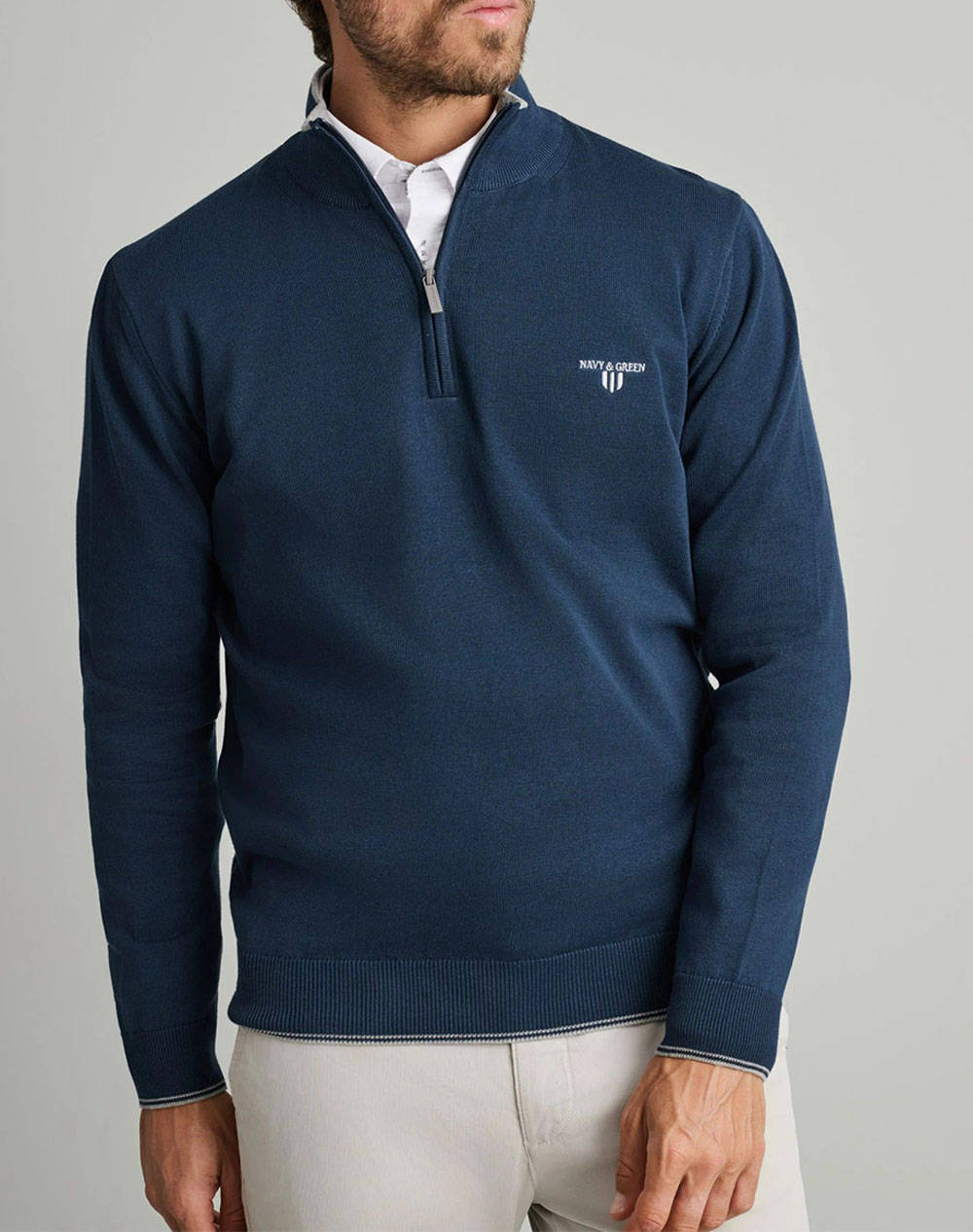 Ανδρική πλεκτή μπλούζα, σε κανονική γραμμή, μονόχρωμη, μακρυμάνικη, με ψηλή λαιμόκοψη με zip και contrast χρώμα εσωτερικά του γιακά.(Σύνθεση: 100% Βαμβάκι)