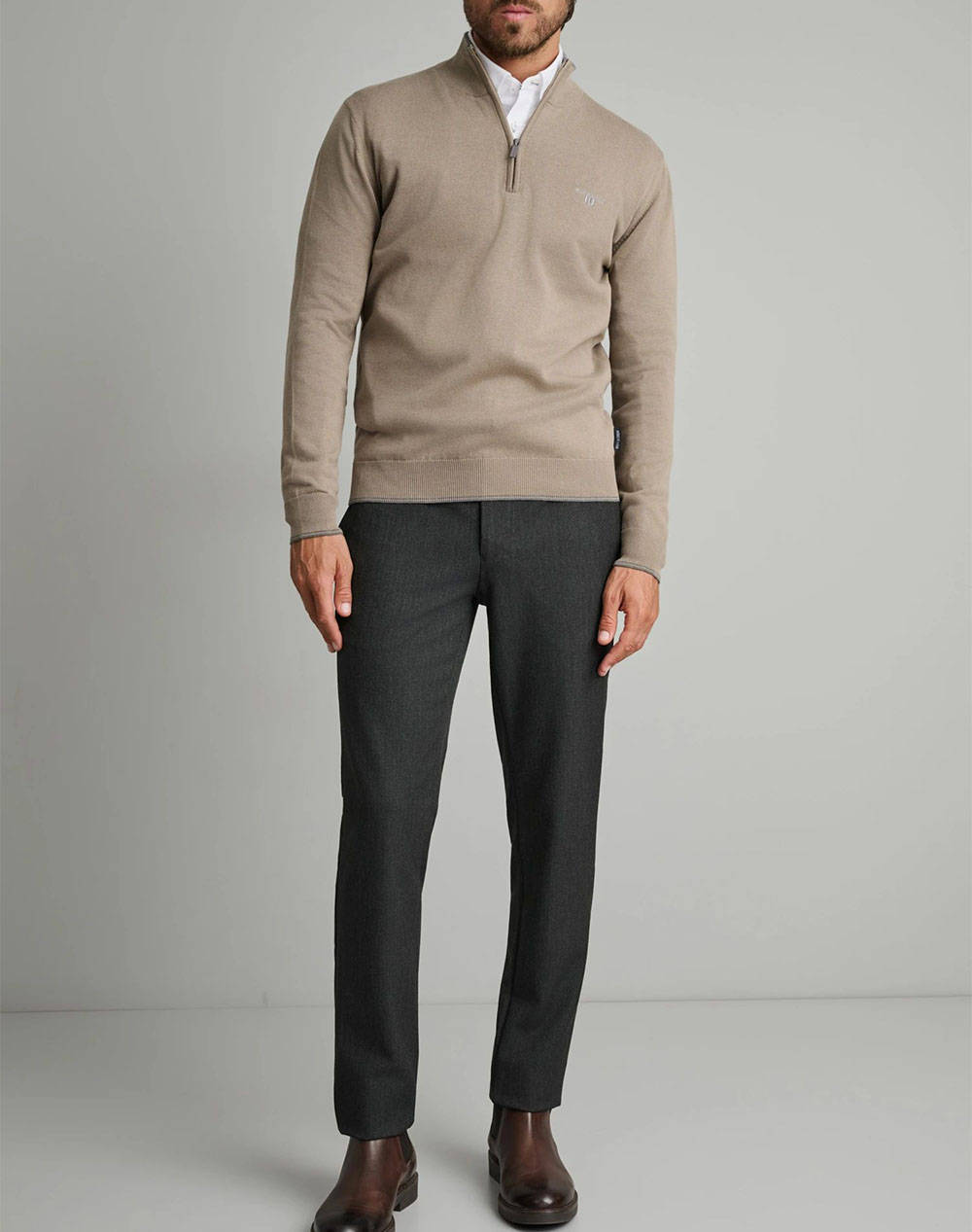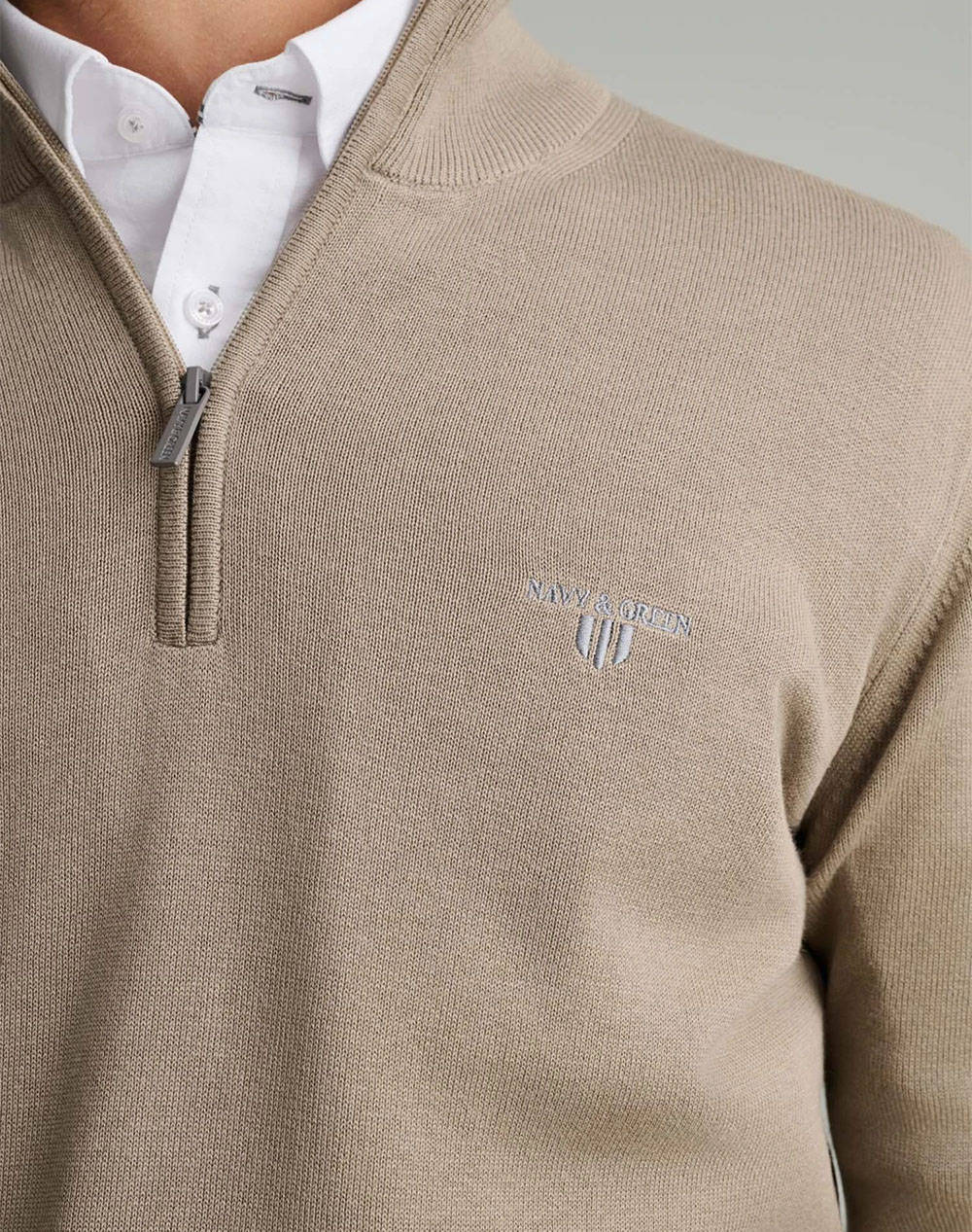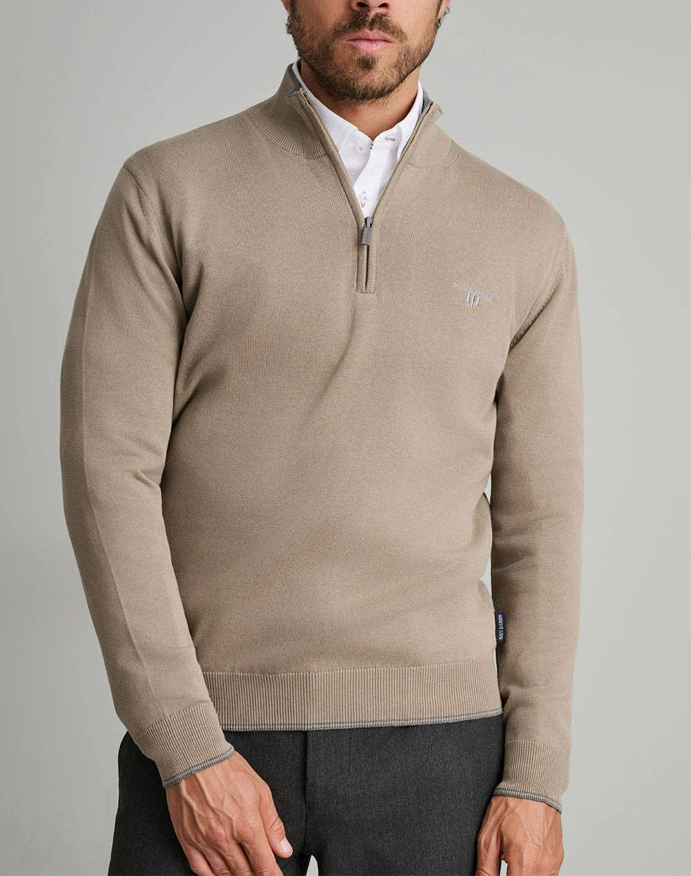 Ανδρική πλεκτή μπλούζα, σε κανονική γραμμή, μονόχρωμη, μακρυμάνικη, με ψηλή λαιμόκοψη με zip και contrast χρώμα εσωτερικά του γιακά.(Σύνθεση: 100% Βαμβάκι)