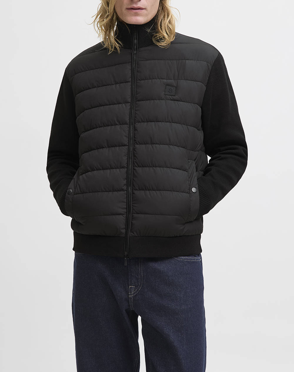 Ανδρικό jacket, σε κανονική γραμμή, με καπιτονέ σχέδιο και πλεκτά μανίκια. Διαθέτει πλαϊνές τσέπες και κλείσιμο με φερμουάρ διπλής κατεύθυνσης. (Σύνθεση: 100% Πολυεστέρας, Επένδυση: 100% Νάιλον)