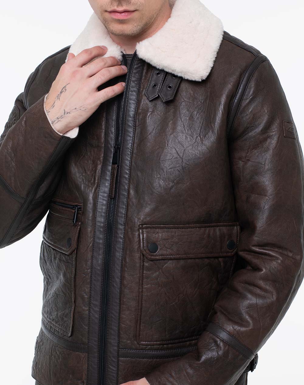 Ανδρικό μπουφάν, σε κανονική γραμμή, με επένδυση από οικολογική γούνα, μπροστινές τσέπες με καπάκι και κλείσιμο κατά μήκος με φερμουάρ. (Σύνθεση: 100% Δέρμα, Επένδυση: 100% Πολυεστέρας)