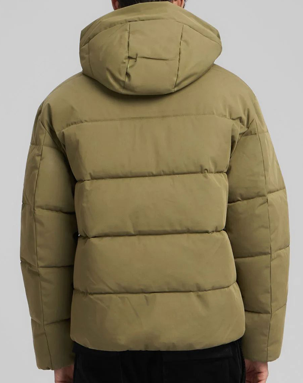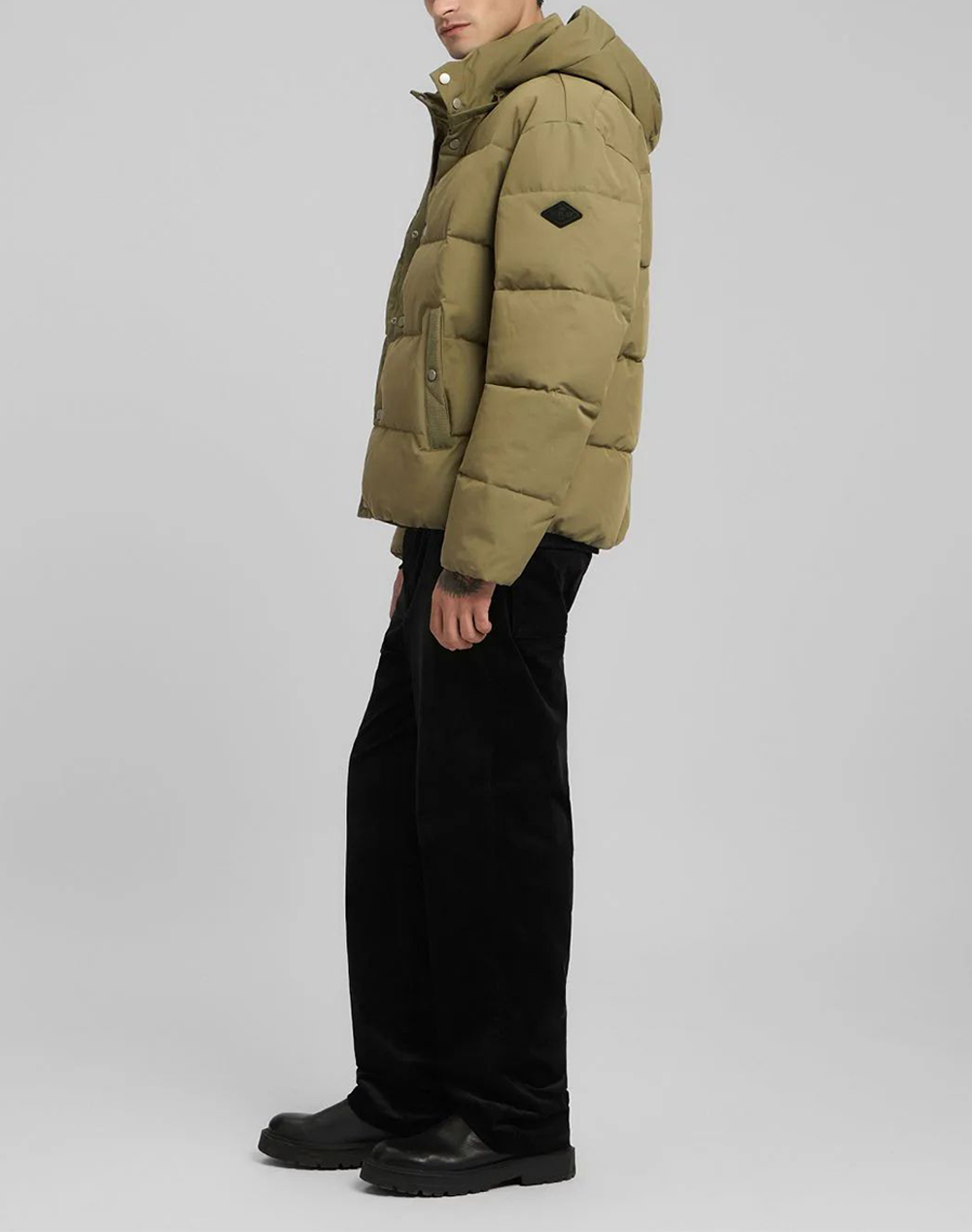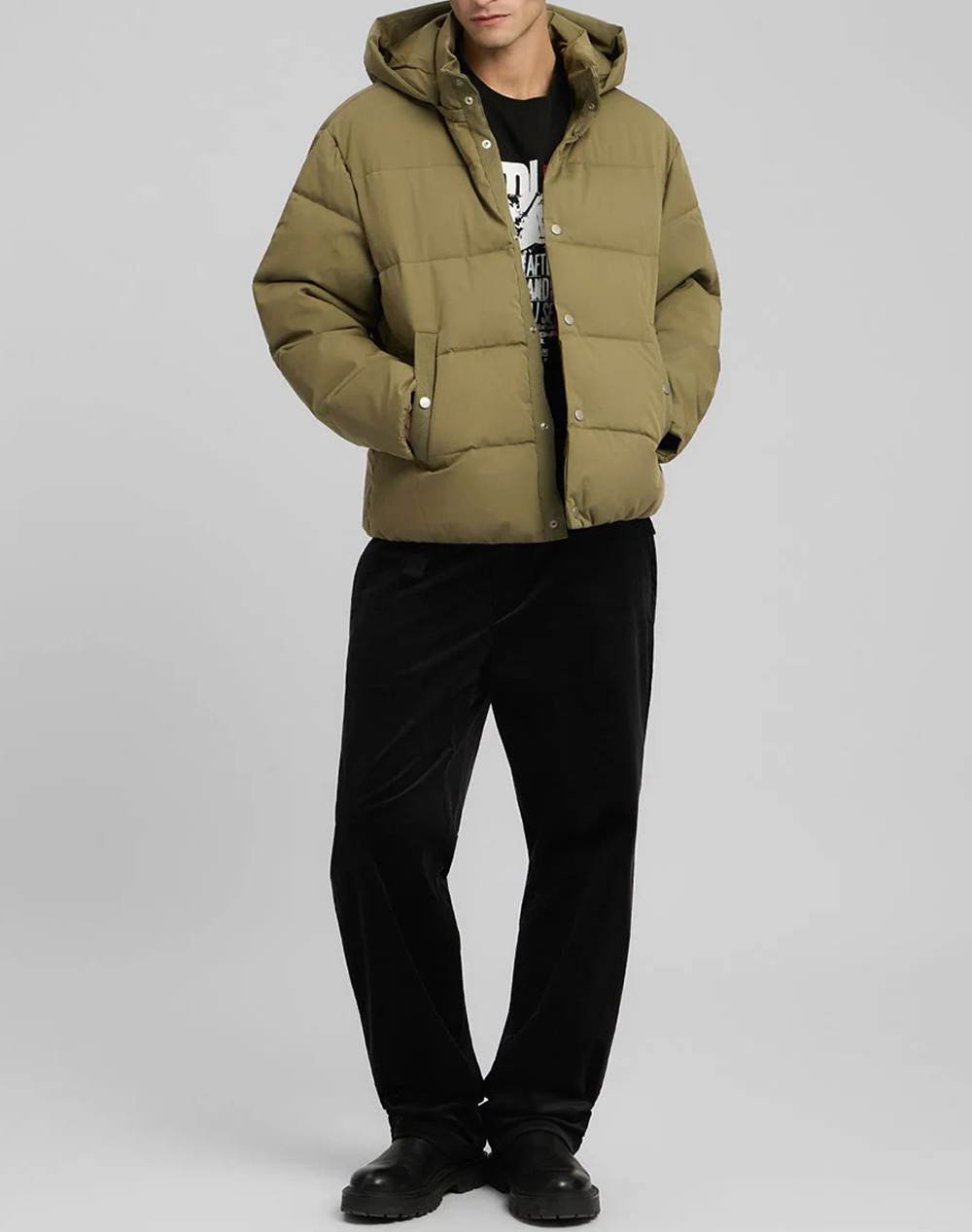 Ανδρικό μπουφάν, σε κανονική γραμμή, με πλαϊνές τσέπες, κουκούλα, όρθιο γιακά και κλείσιμο με κουμπιά. (Σύνθεση: 73% Βαμβάκι, 27% Πολυαμίδιο)