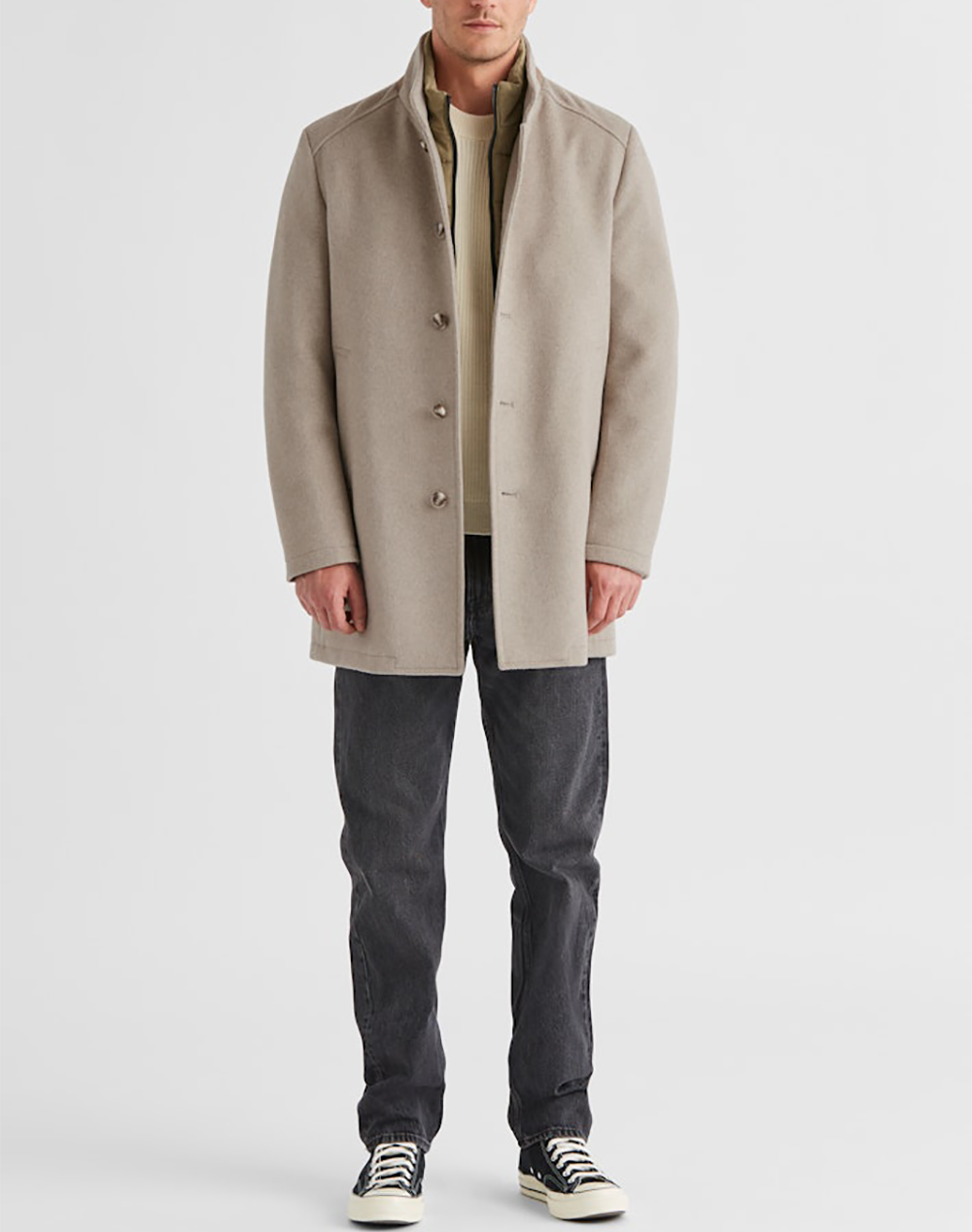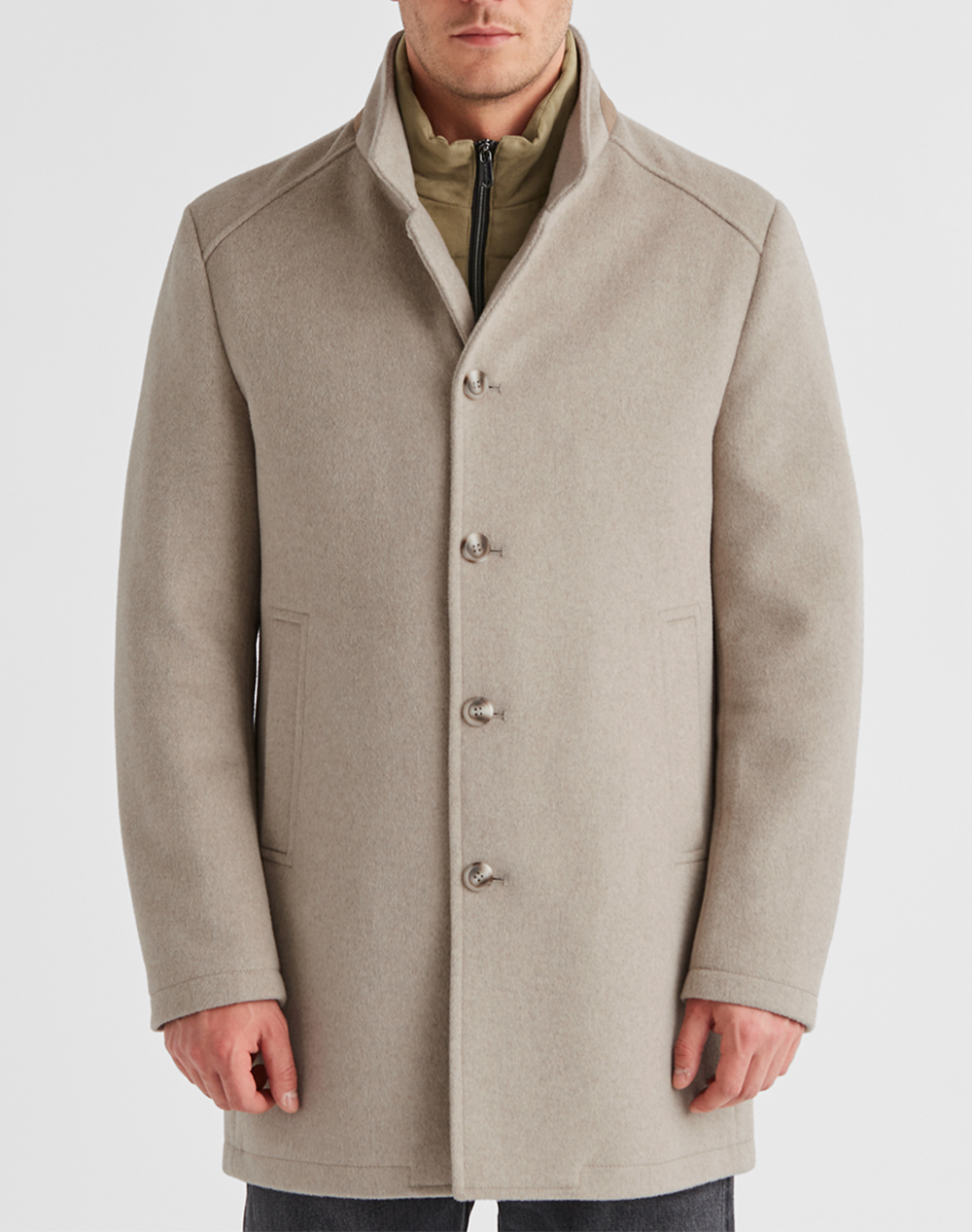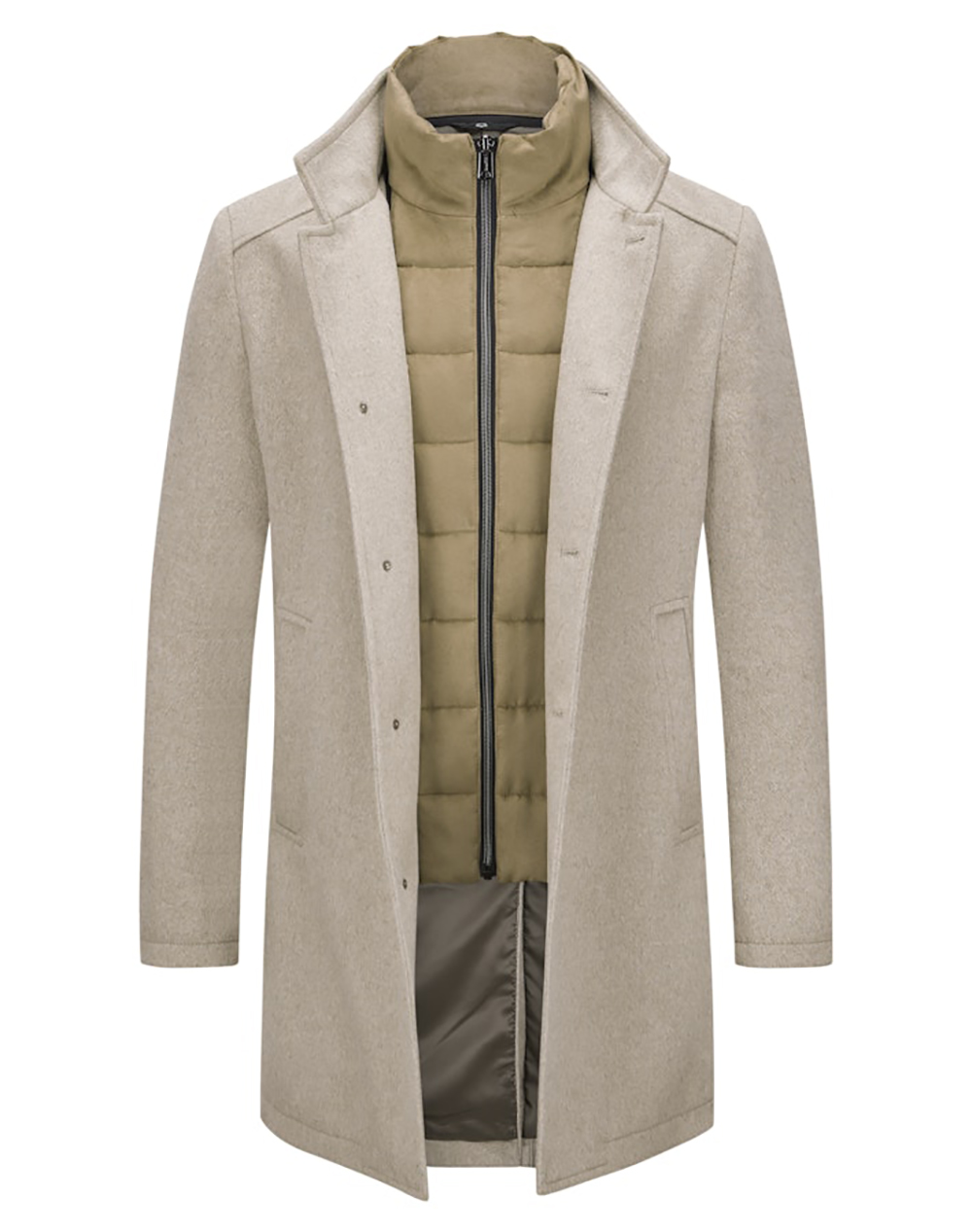 Ανδρικό παλτό σε slim fit, μακρυμάνικο, με αφαιρούμενο καπιτονέ εσωτερικίο με φερμουάρ, πλαϊνές τσέπες, όρθιο γιακά και κλείσιμο με κουμπιά. (Σύνθεση: 60% Ανακυκλωμένος Πολυεστέρας, 30% Ανακυκλωμένο Μαλλί, 10% Άλλες ίνες.)