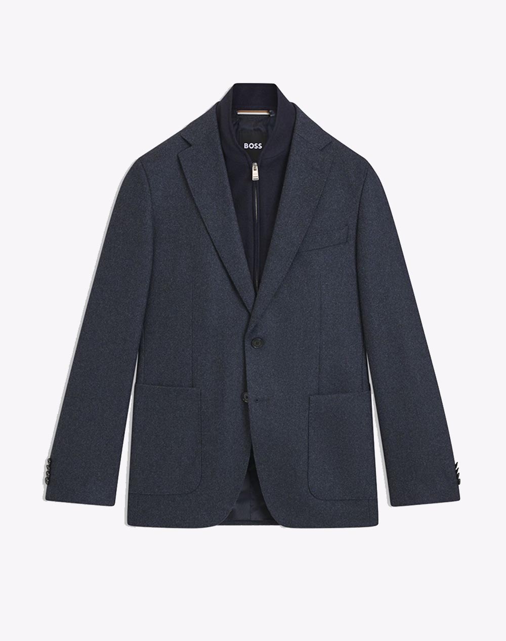 Ανδρικό δίκουμπο σακάκι, σε στενή γραμμή, με εσωτερικό ένθετο που κλείνει με φερμουάρ. Διαθέτει γιακά πέτο, δύο μπροστινές τσέπες και μία στο στήθος. (Σύνθεση: 70% Ανακυκλωμένο μαλλί, 30% Πολυαμίδιο)