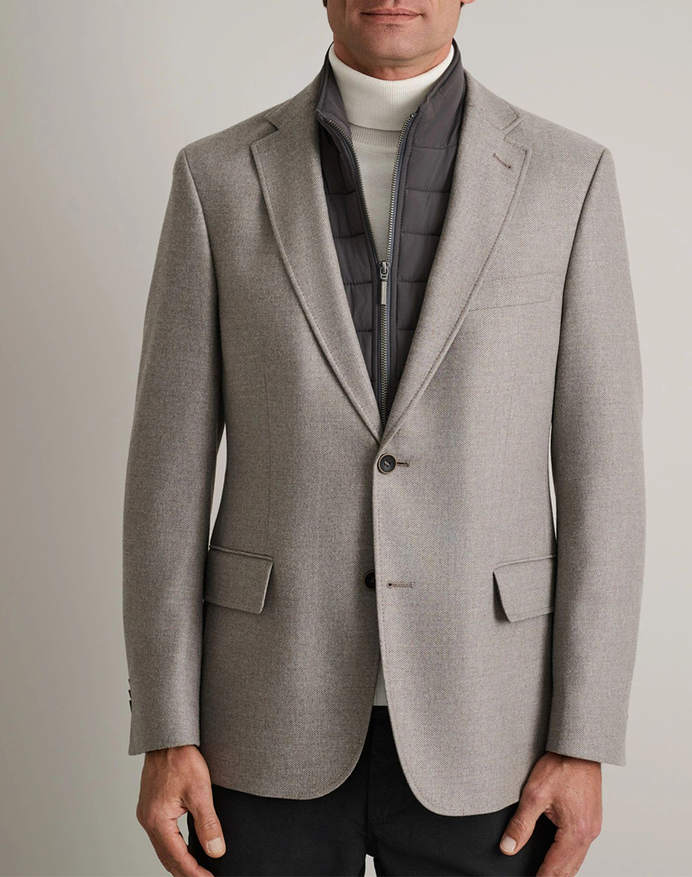 Ανδρικό σακάκι, σε κανονική γραμμή, με αποσπώμενο γιλέκο εσωτερικά με φερμουάρ, γιακά πέτο και κλείσιμο με κουμπιά. (Σύνθεση: 49% Πολυεστέρας, 26% Βισκόζη, 17% Μαλλί, 5% Πολυαμίδιο, 3% Ελαστάνη)