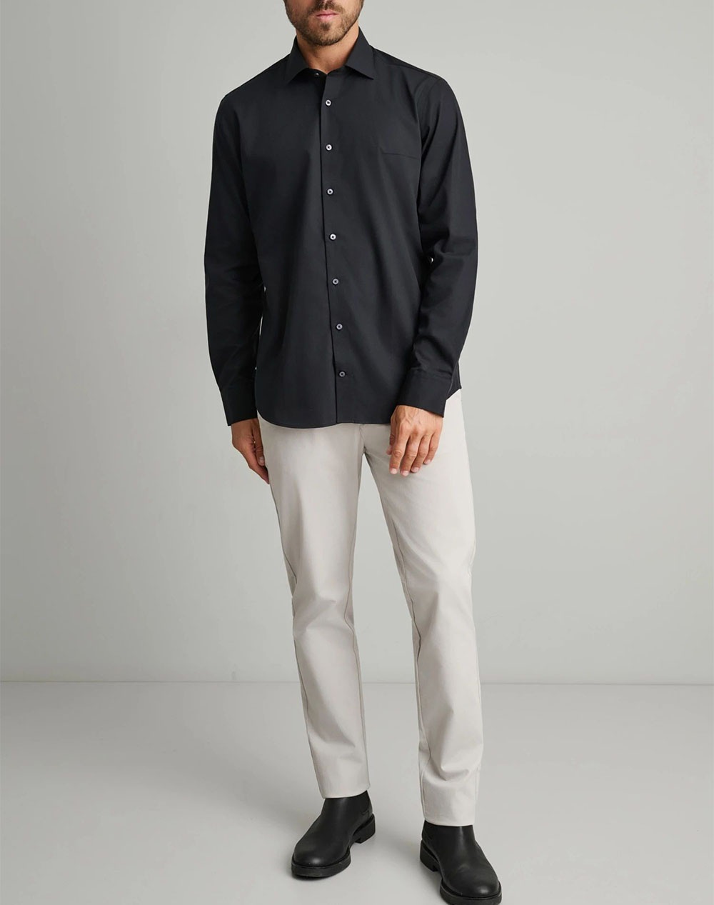 Ανδρικό πουκάμισο, σε κανονική γραμμή, μακρυμάνικο, μονόχρωμο, με ανοιχτό γιακά και κλείσιμο με κουμπιά.(Σύνθεση: 100% Βαμβάκι)