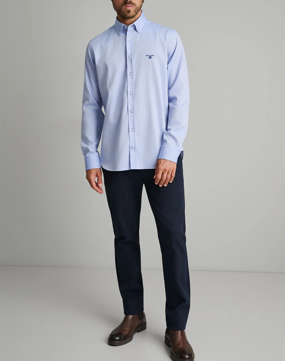 Ανδρικό πουκάμισο σε κανονική γραμμή, μονόχρωμο, μακρυμάνικο, με button down γιακά, λογότυπο στο στήθος και κλείσιμο με κουμπιά μπροστά. (Σύνθεση: 100% Βαμβάκι)