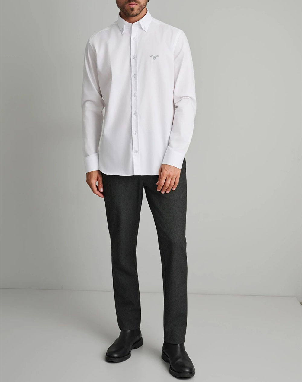 Ανδρικό πουκάμισο σε κανονική γραμμή, μονόχρωμο, μακρυμάνικο, με button down γιακά, λογότυπο στο στήθος και κλείσιμο με κουμπιά μπροστά. (Σύνθεση: 100% Βαμβάκι)