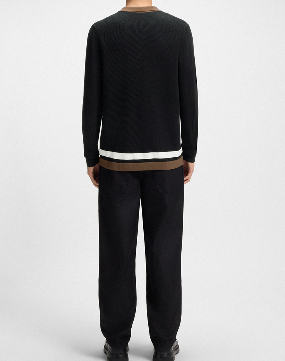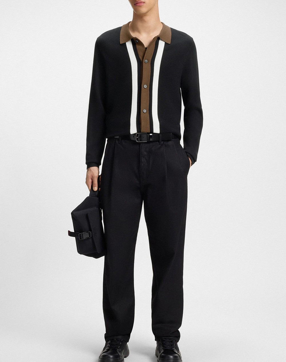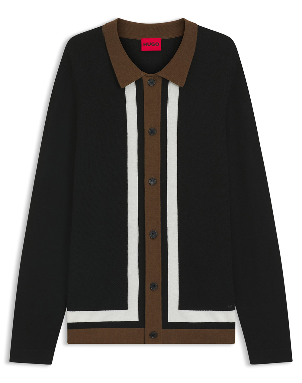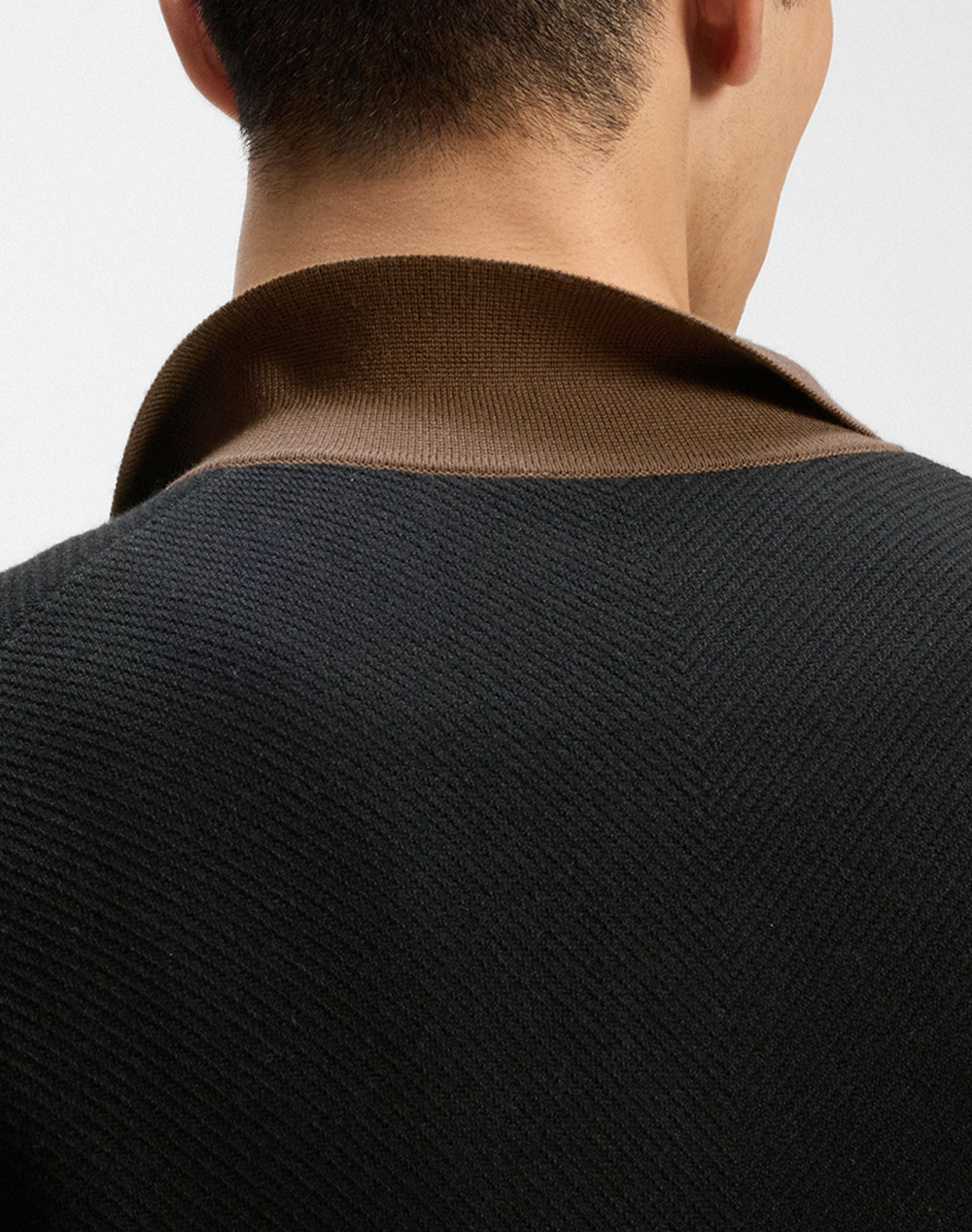 Ανδρική πλεκτή ζακέτα, σε χαλαρή γραμμή, με γιακά polo, λεπτομέρειες σε αντίθεση και κλείσιμο μπροστά με κουμπιά. (Σύνθεση: 55% Βισκόζη, 30% Πολυαμίδιο, 15% Μαλλί)