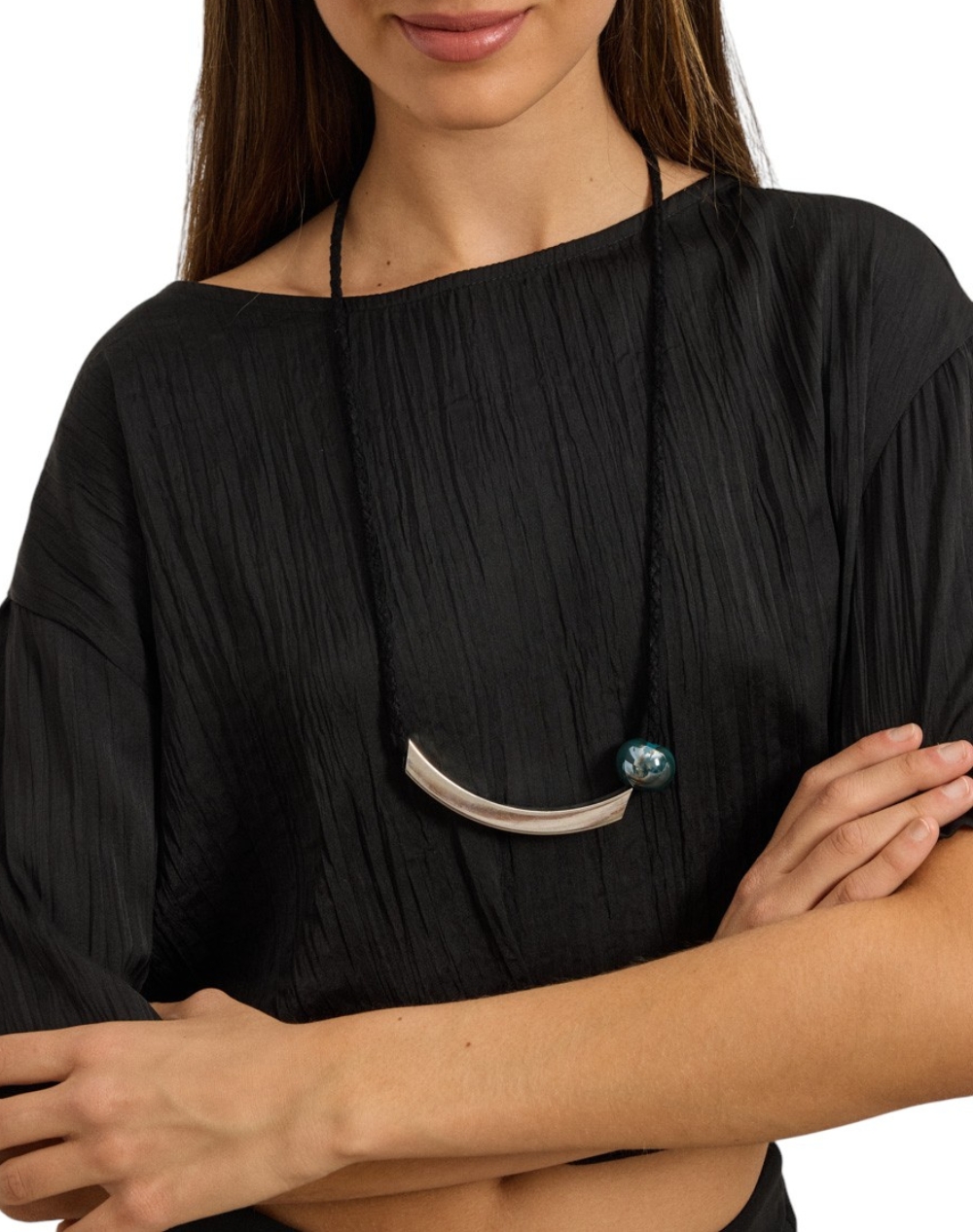 Γυναικείο κολιέ, με κορδόνι σε συνδυασμό με μεταλλικό σωλήνα και χάντρα. (Σύνθεση: Συνθετικό υλικό)