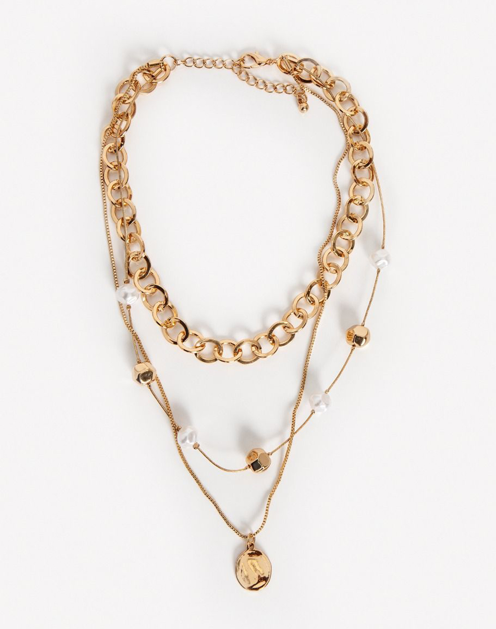 Γυναικείο κολιέ, με layers, μεταλλικά στοιχεία, πέρλες και κλείσιμο με αλυσίδα και παπαγαλάκι.(Σύνθεση: 90% Μεταλλικό υλικό, 10% Πολυανθρακικό)