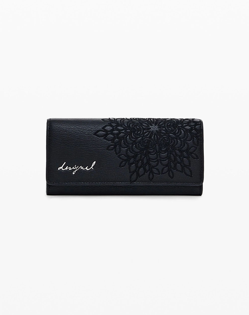 Γυναικείο πορτοφόλι, με κεντητό μοτίβο λουλούδια. Διαθέτει αποσπώμενη θήκη καρτών και κλείνει με κούμπωμα. Διαστάσεις: 19 x 3 x 9.50εκ. (Σύνθεση: 100% Πολυουρεθάνη)