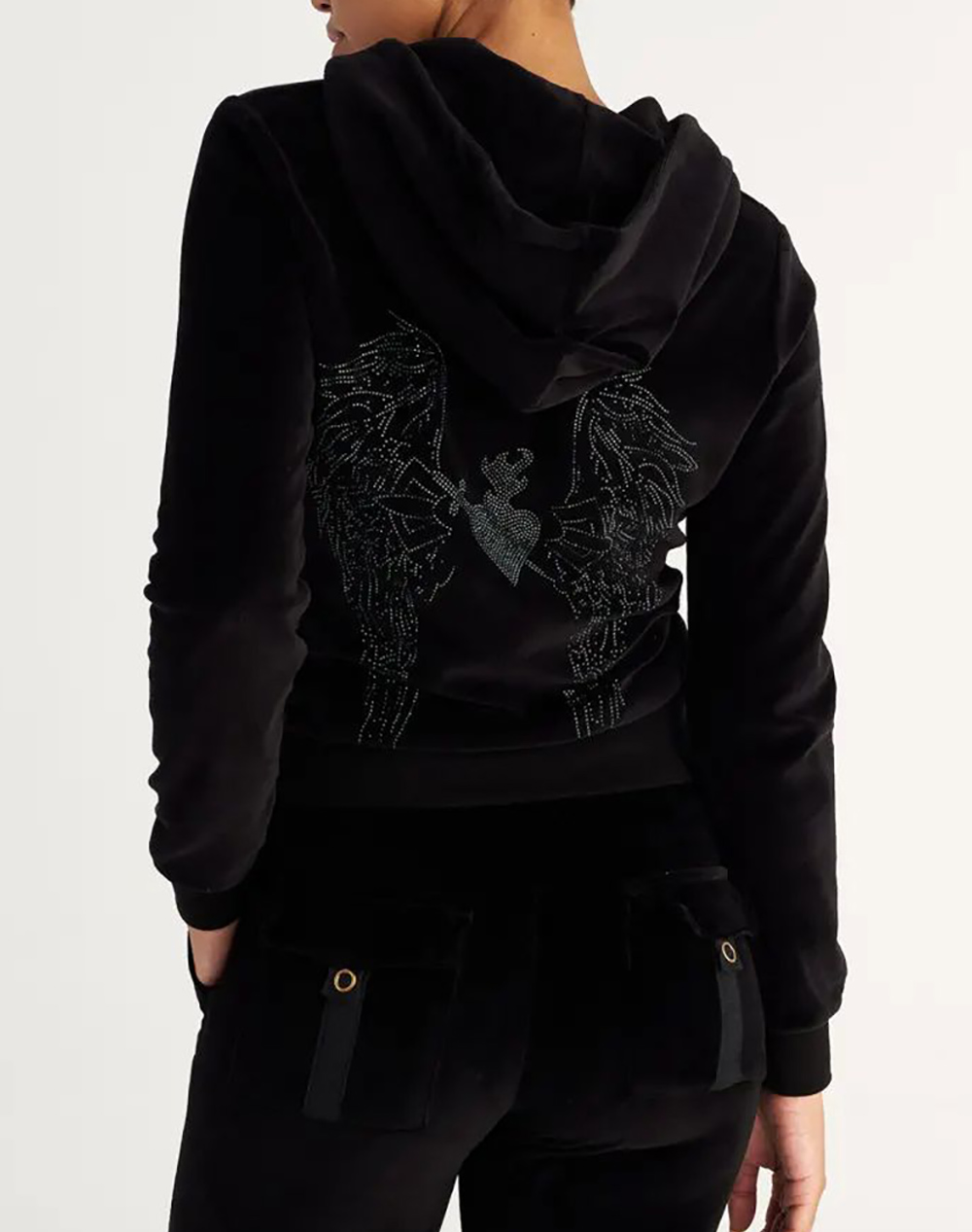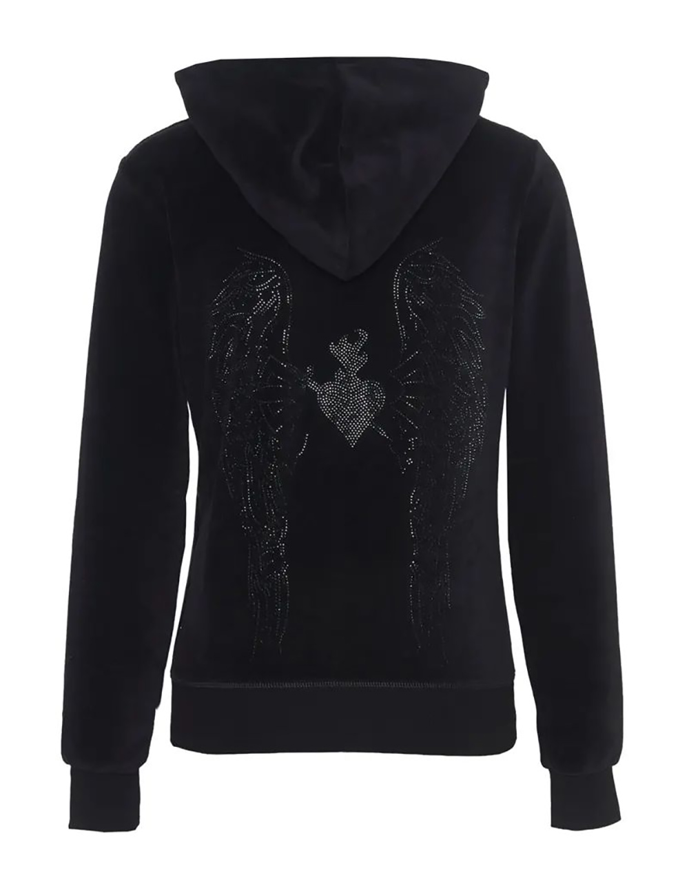 Γυναικεία βελούτε ζακέτα, σε άνετη γραμμή, μακρυμάνικη, με ρυθμιζόμενη κουκούλα, strass σχέδιο στην πλάτη και κλείσιμο μπροστά με φερμουάρ. (Σύνθεση: 80% Βαμβάκι, 20% Πολυεστέρας)
