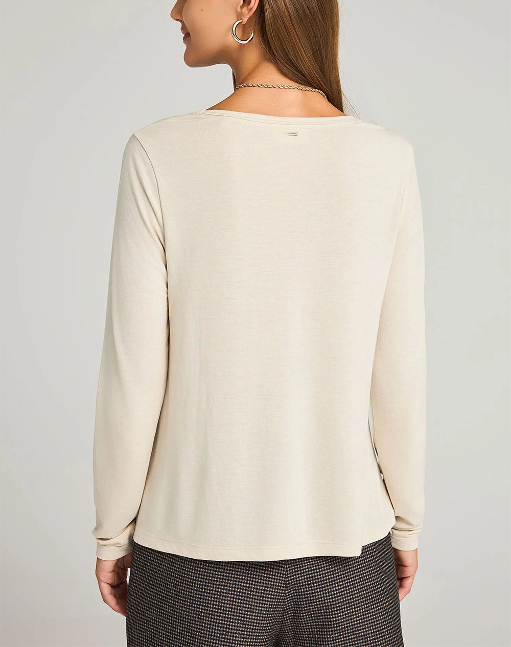 Γυναικεία μπλούζα, σε κανονική γραμμή, μακρυμάμικη, μονόχρωμη, με στρογγυλή λαιμόκοψη και ασύμμετρο τελείωμα. (Σύνθεση: 65% Πολυεστέρας, 35% Βισκόζη)