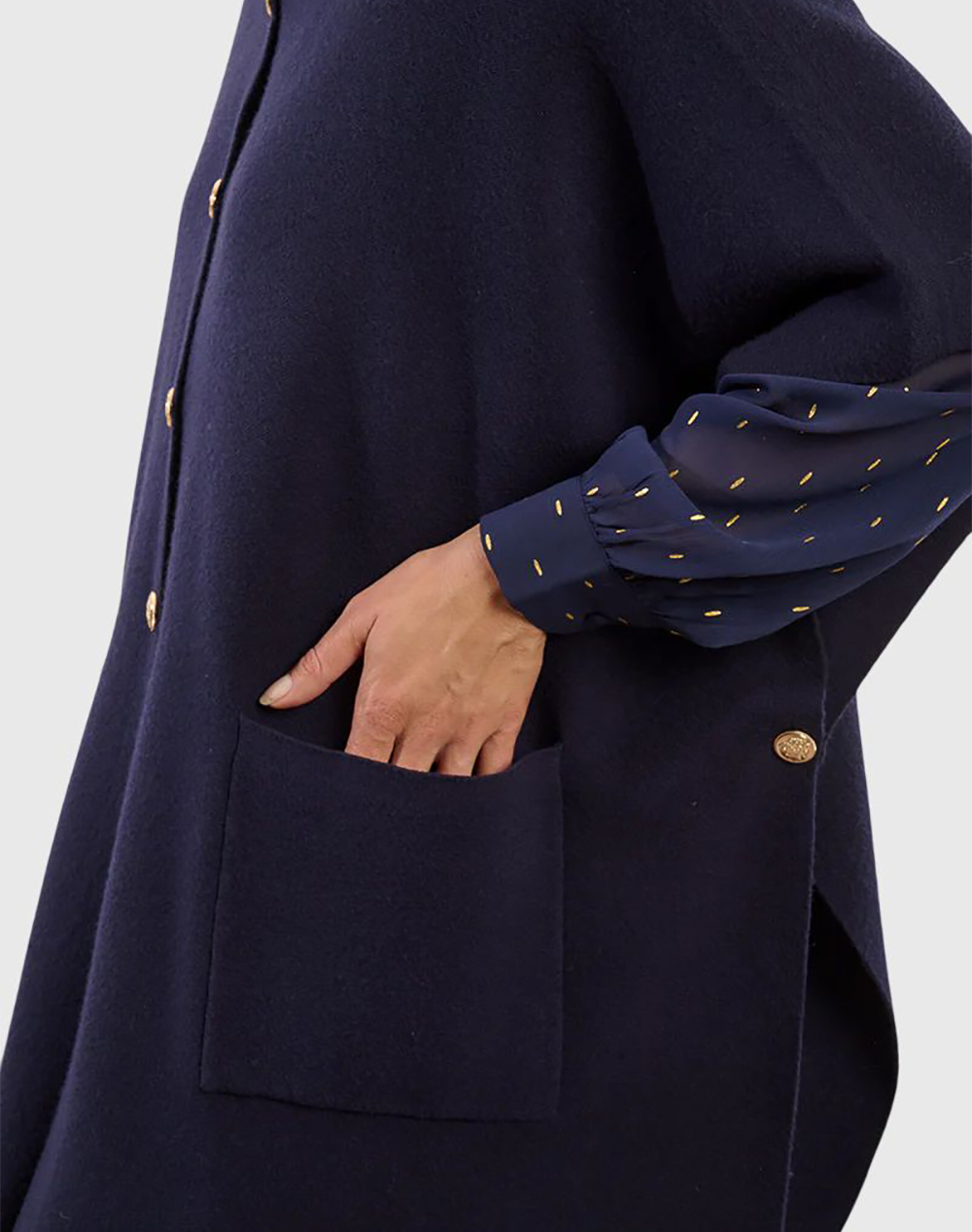 Γυναικεία πλεκτή κάπα, σε φαρδιά γραμμή, με φαρδιά μανίκια 3/4, όρθιο γιακά, τσέπες μπροστά και κλείσιμο με μεταλλικά κουμπιά. (Σύνθεση: 51% Βισκόζη, 30% Πολυεστέρας, 19% Πολυαμίδιο)