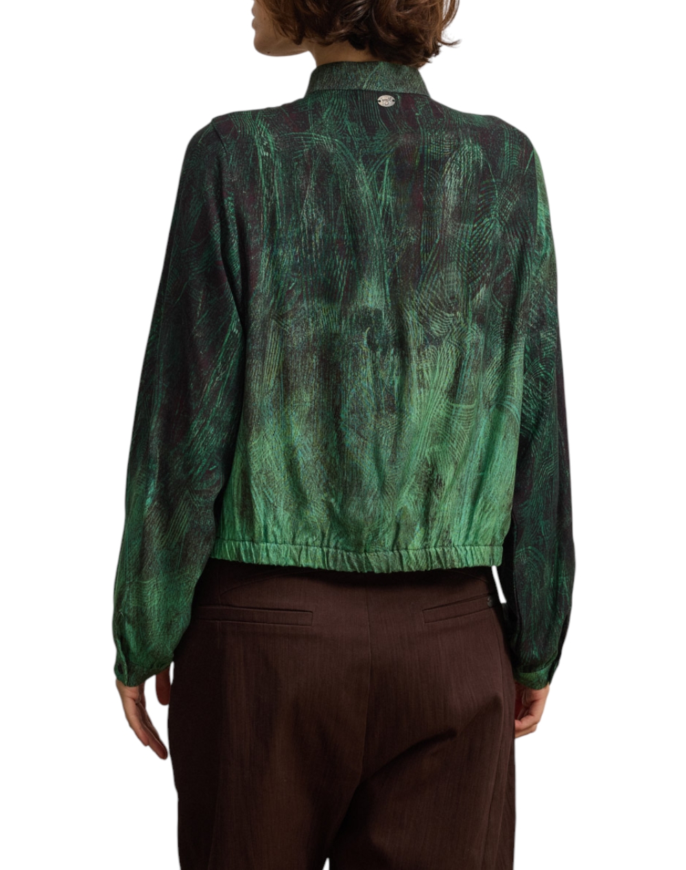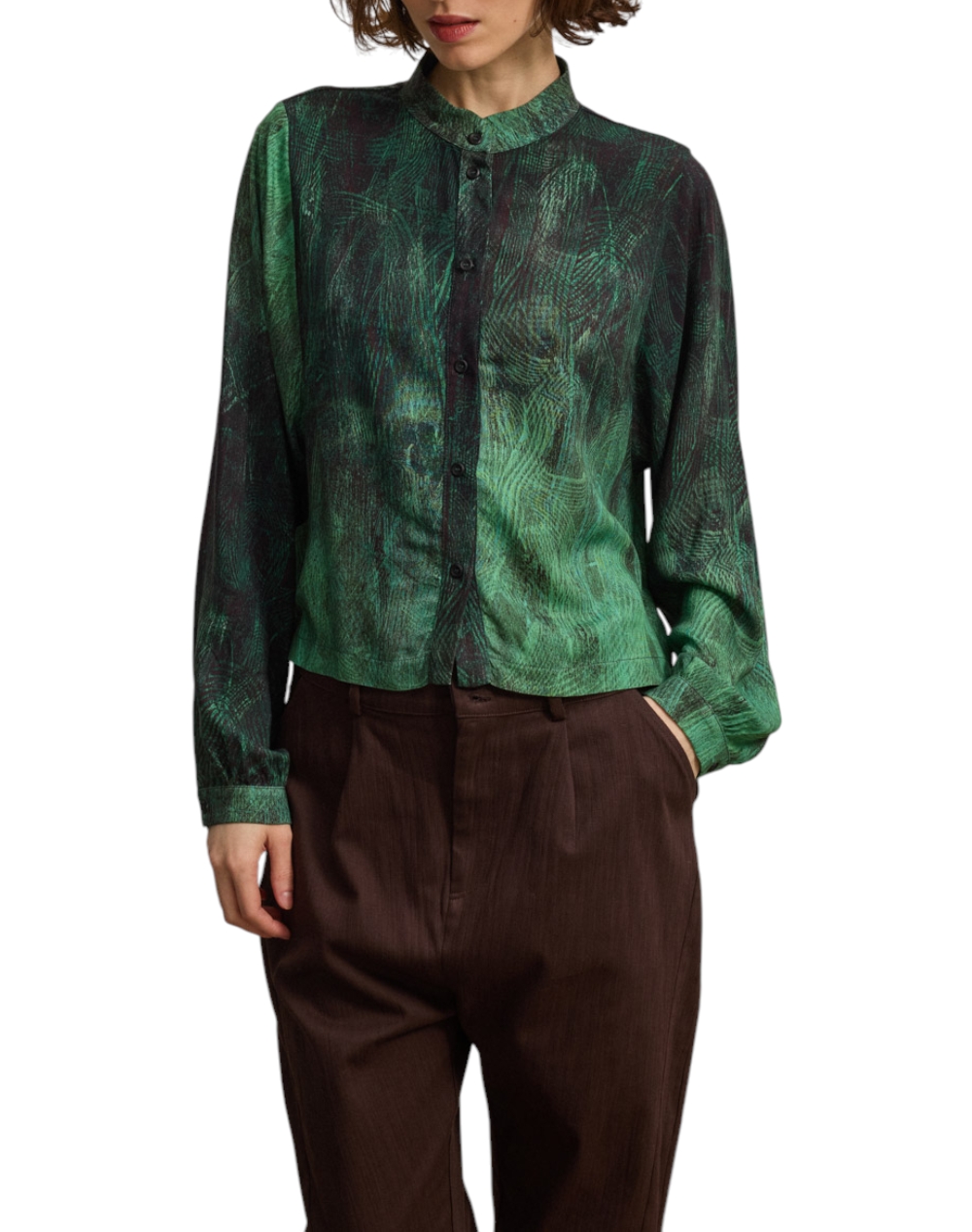 Γυναικείο πουκάμισο, cropped, μακρυμάνικο, με brushstroke μοτίβο, όρθιο γιακά και κλείσιμο με κουμπιά μπροστά. (Σύνθεση:100% Ecovero Βισκόζη)