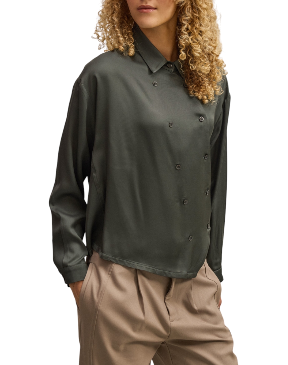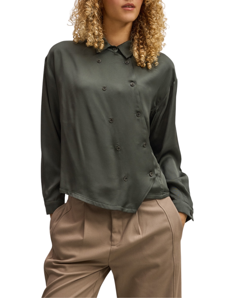 Γυναικείο πουκάμισο, μακρυμάνικο, με μεταξένια υφή, κλασικό γιακά και ασύμμετρο μπροστινό κλείσιμο με διπλή σειρά κουμπιών. (Σύνθεση: 52% Ecovero Βισκόζη, 48% Ρεγιόν)