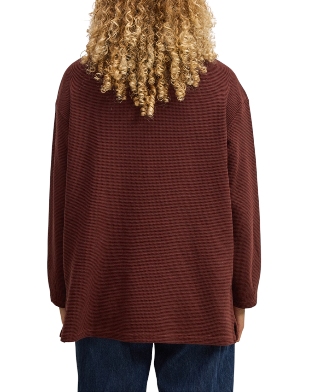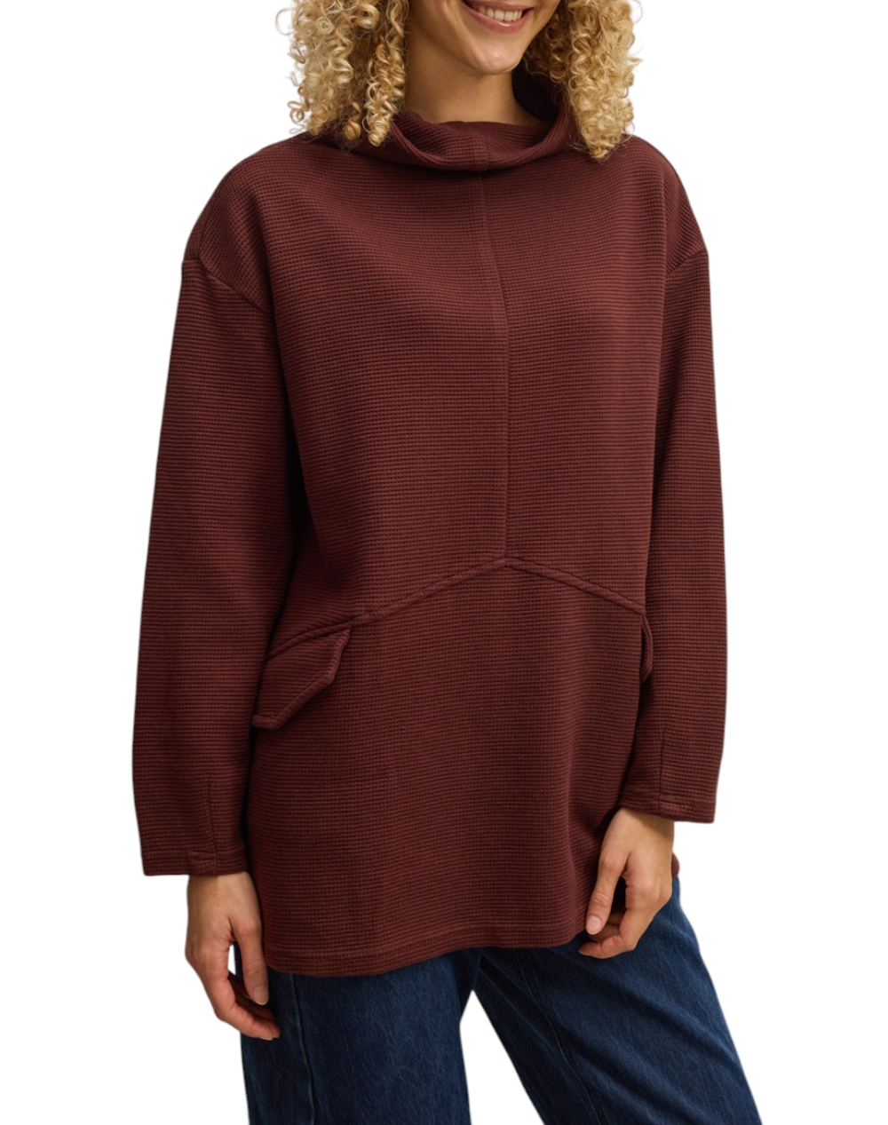 Γυναικεία μπλούζα, σε άνετη γραμμή, μακρυμάνικη, με waffle υφή, όρθιο γιακά με χαλαρό ζιβάγκο και πλάγιες τσέπες. (Σύνθεση: 100% Βαμβάκι)