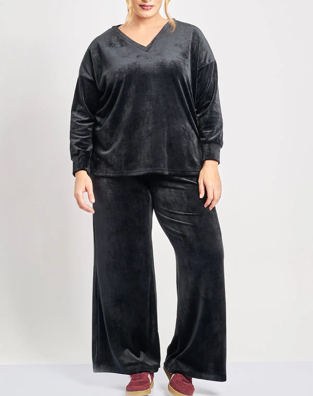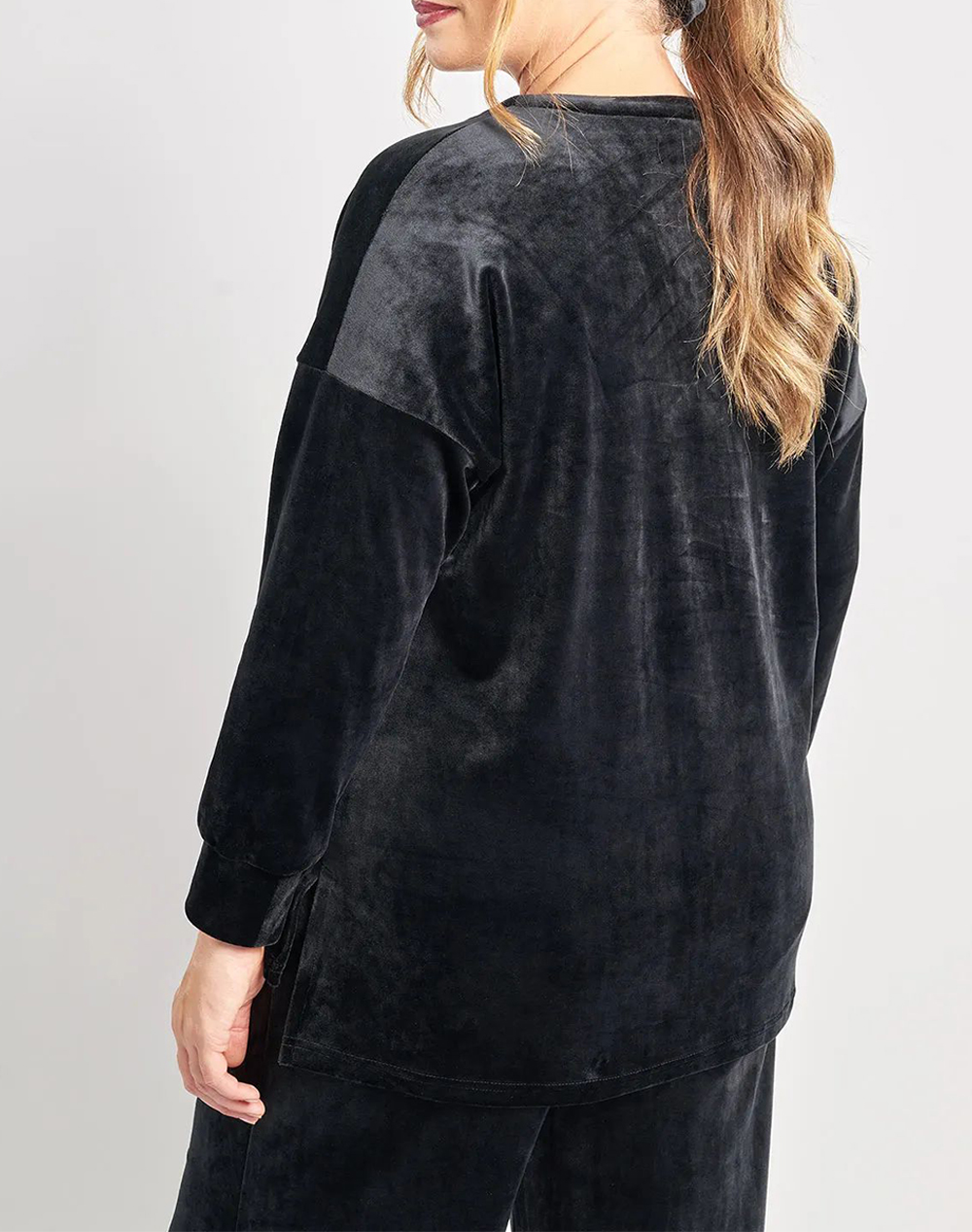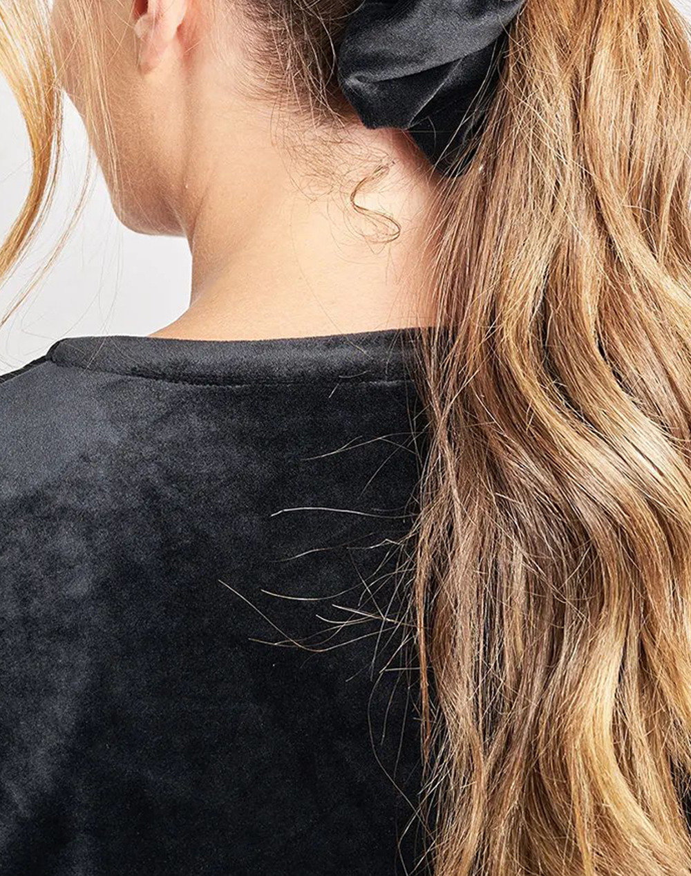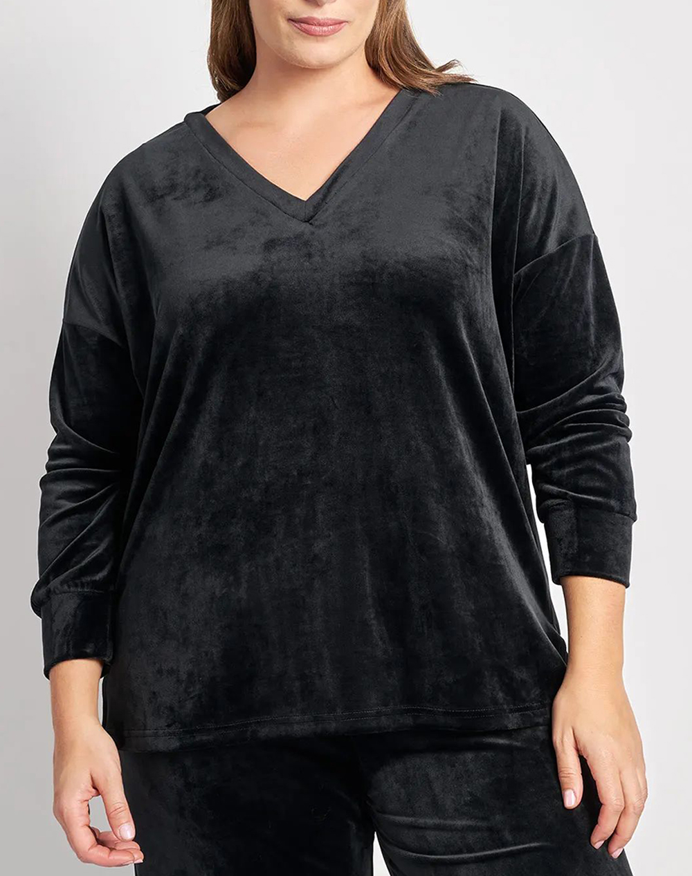 Γυναικεία μπλούζα βελουτέ, σε άνετη γραμμή, μακρυμάνικη, με "V" λαιμόκοψη και ασορτί scrunchie.(Σύνθεση: 92% Πολυεστέρας, 8% Ελαστάνη)