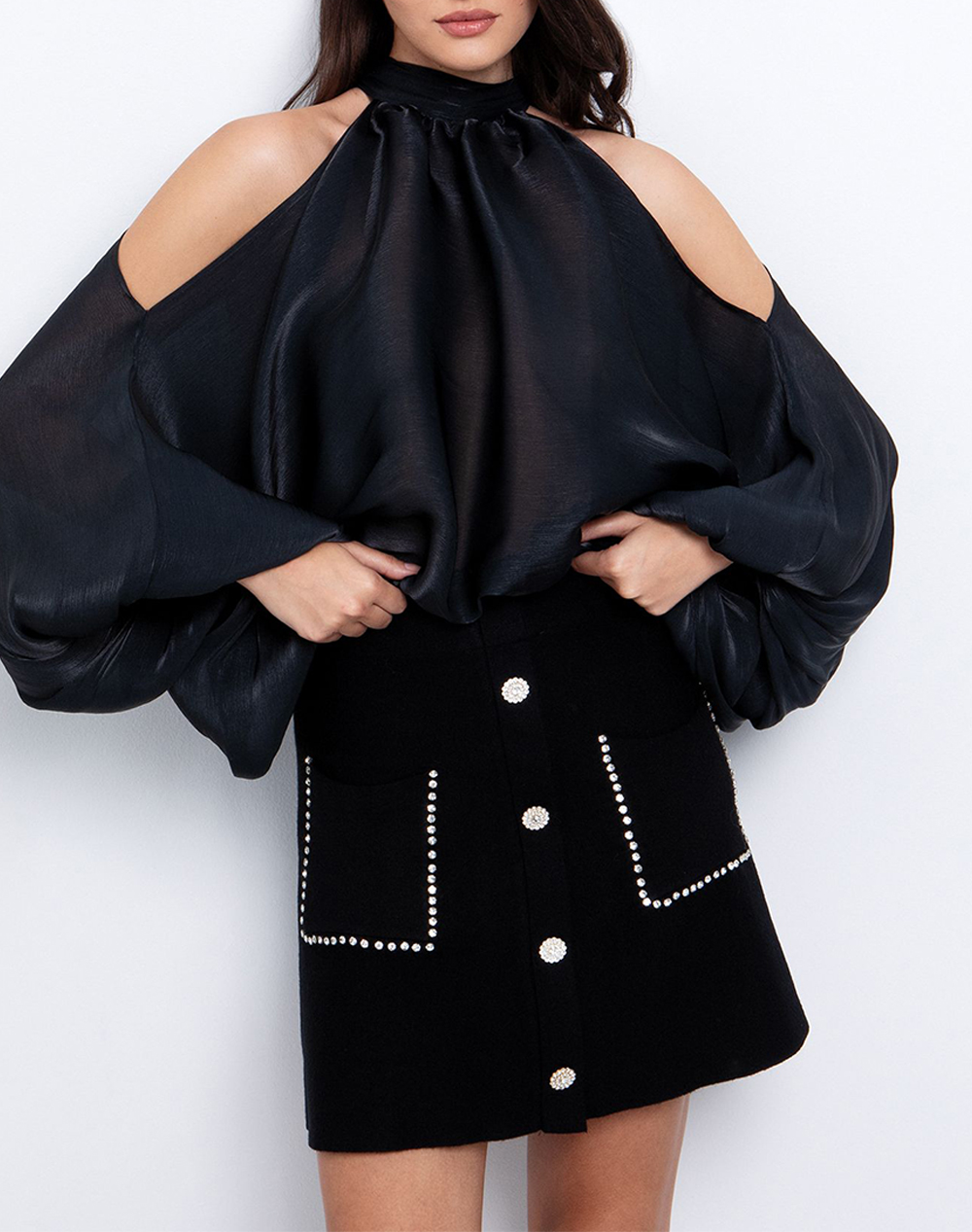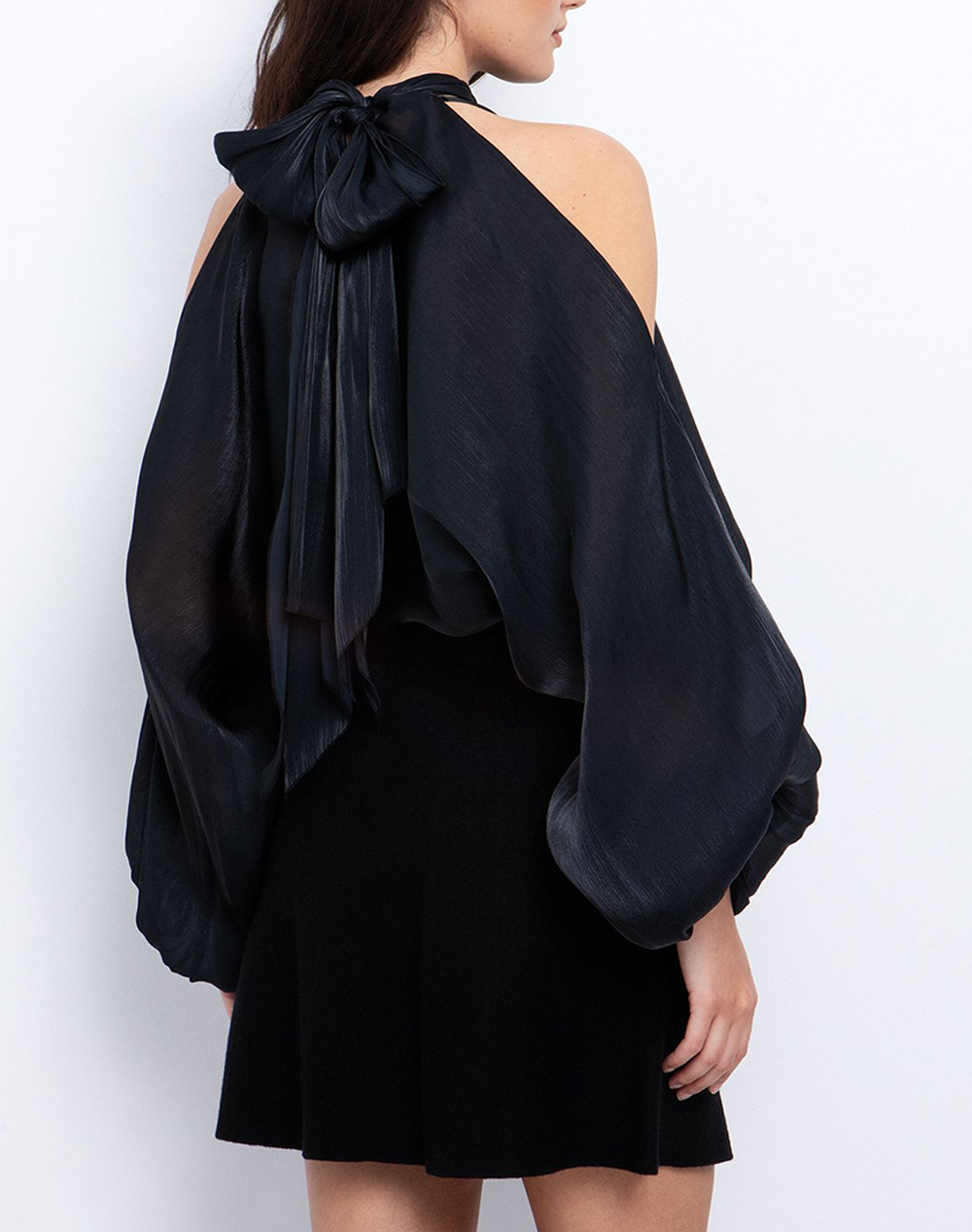 Γυναικείο oversized τοπ, μονόχρωμο, με σατινέ υφή, balloοn σχέδιο, ψηλό λαιμό με ντραπέ λεπτομέρειες, ασορτί δέσιμο στο πίσω μέρος και λάστιχο στο τελείωμα. (Σύνθεση: 100% Πολυεστέρας)