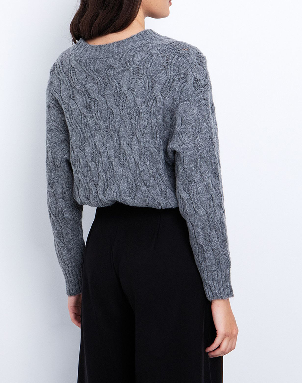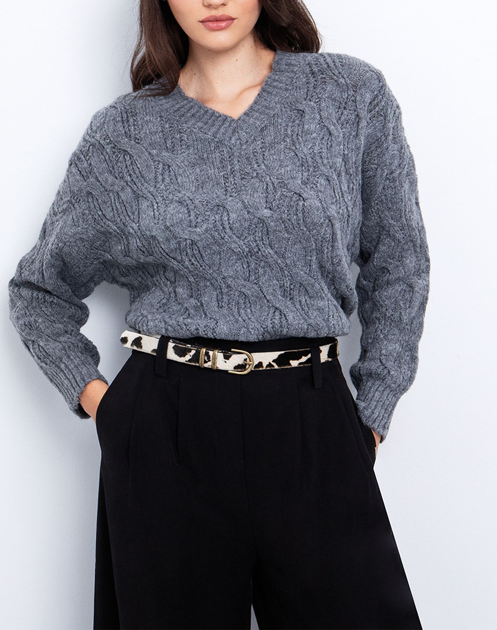 Γυναικείο πουλόβερ, σε κανονική γραμμή, μακρυμάνικο, με λαιμόκοψη V και σχέδιο πλεξούδα. (Σύνθεση: 57% Polycarbonates, 29% Πολυαμίδιο, 7% Μαλλί, 7% Βισκόζη)