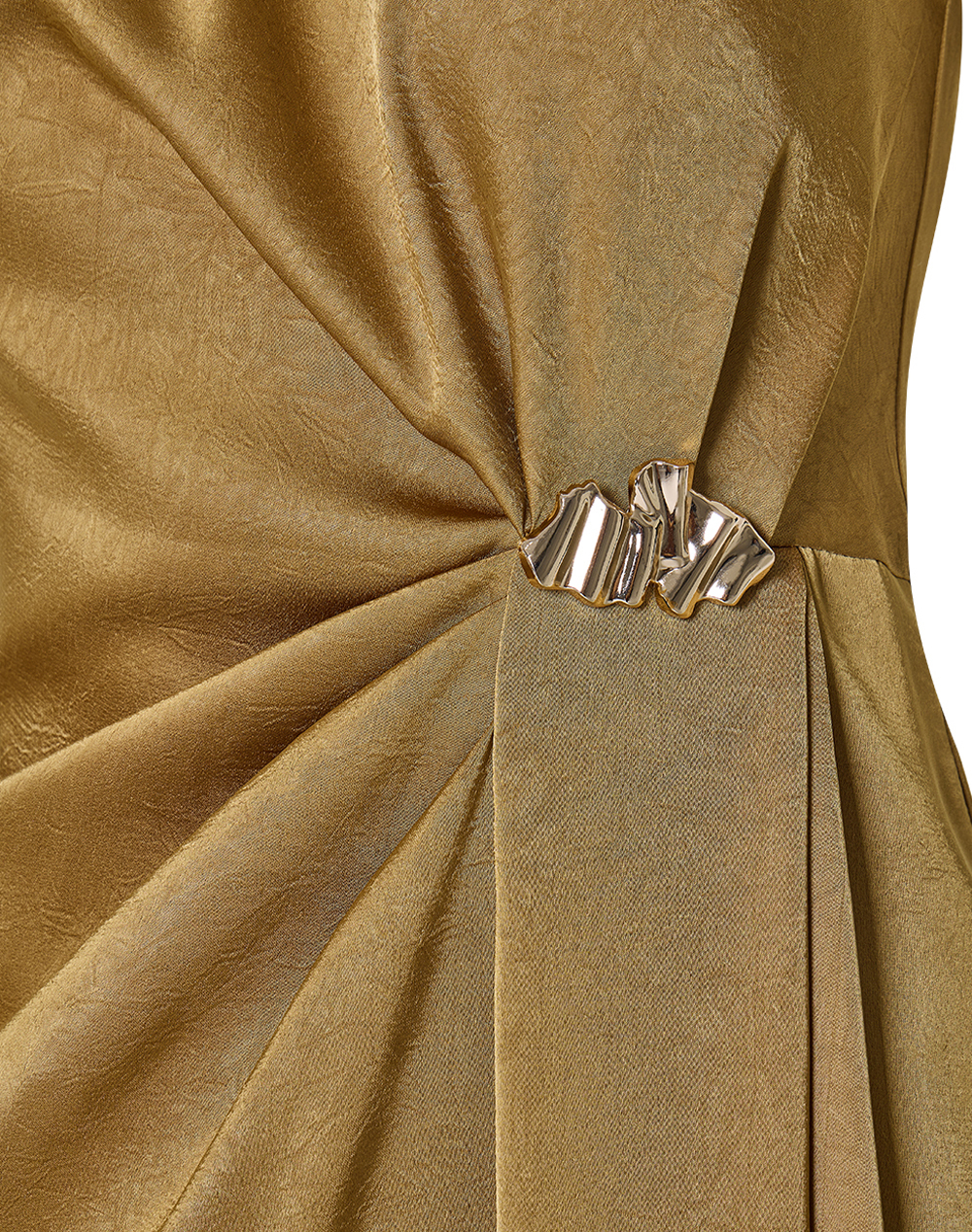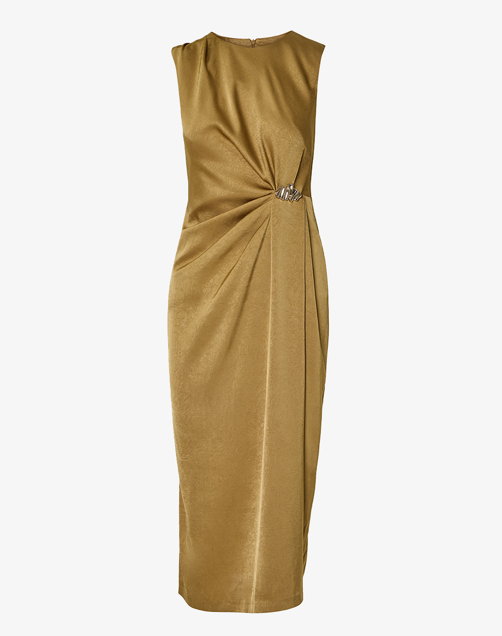 Γυναικείο σατέν φόρεμα, αμάνικο, με στρογγυλή λαιμόκοψη, ντραπέ σχέδιο μπροστά με πιάσιμο χρυσό κόσμημα και κλείσιμο με φερμουάρ στην πλάτη. (Σύνθεση: 100% Πολυεστέρας)