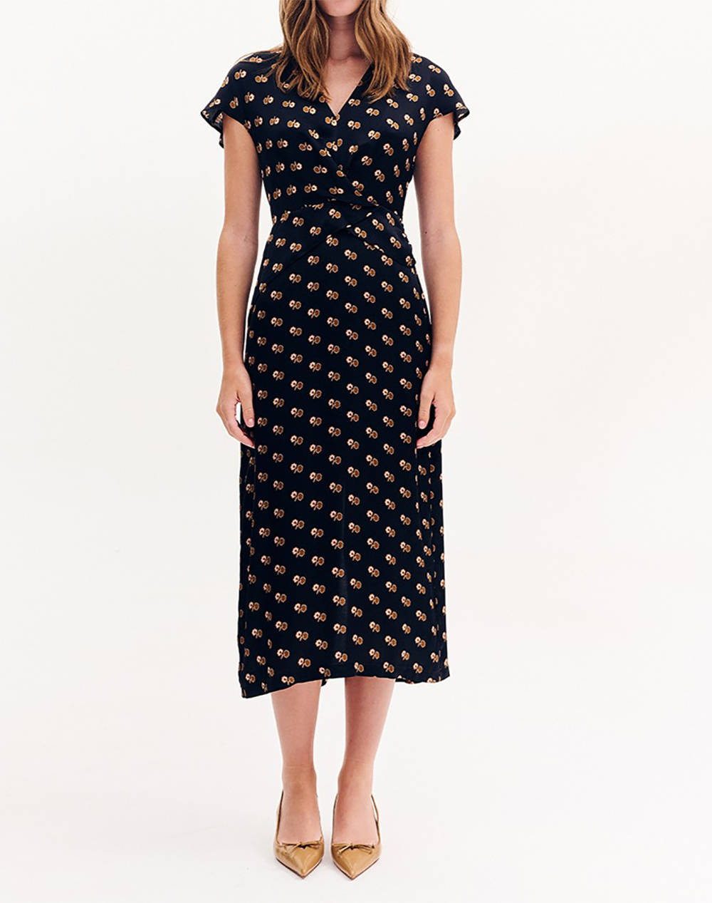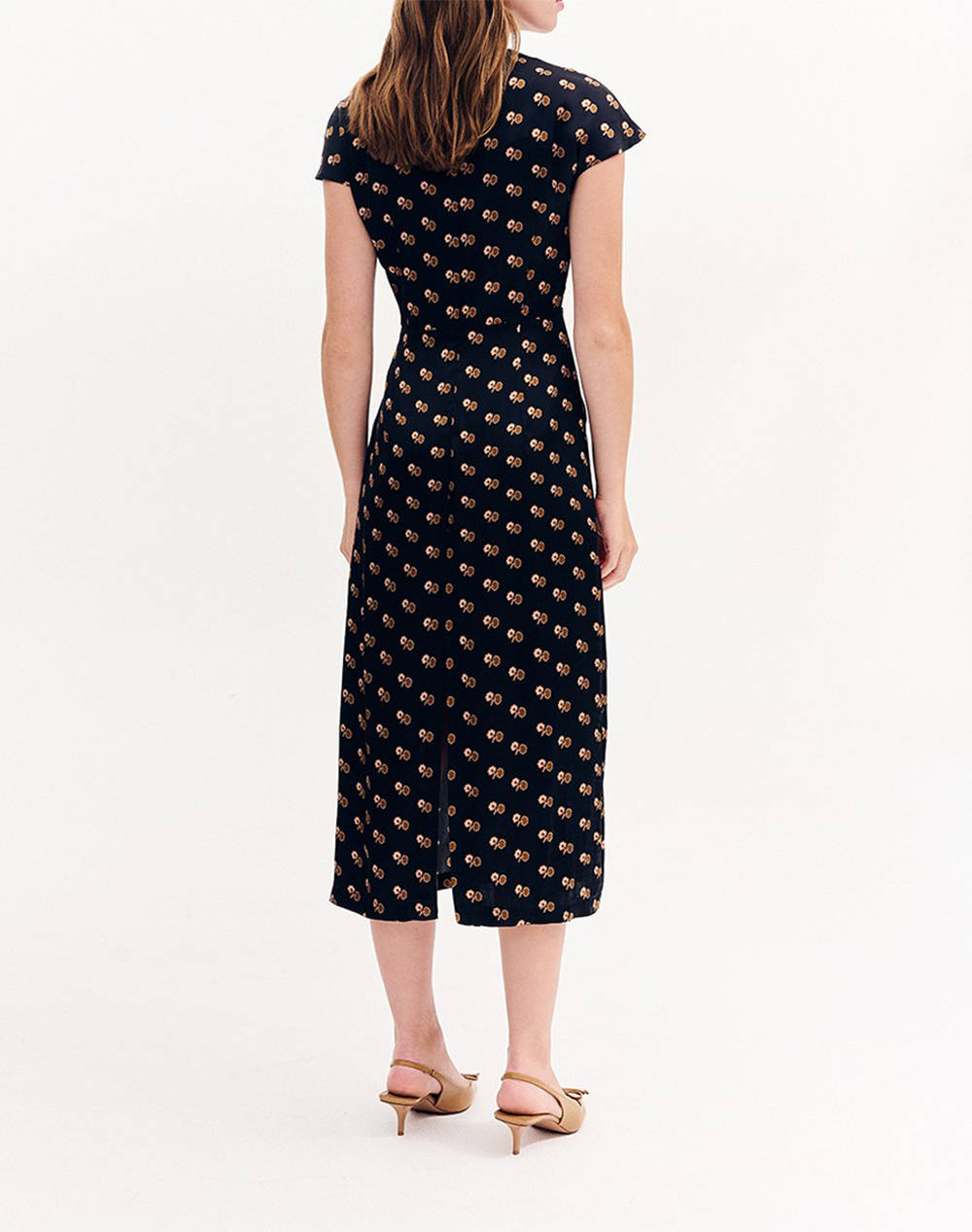 Γυναικείο midi φόρεμα, κοντομάνικο, με "V" ντεκολτέ, ντραπέ σχέδιο μπροστά και κλείσιμο με φερμουάρ στην πλάτη. (Σύνθεση: 100% Βισκόζη)