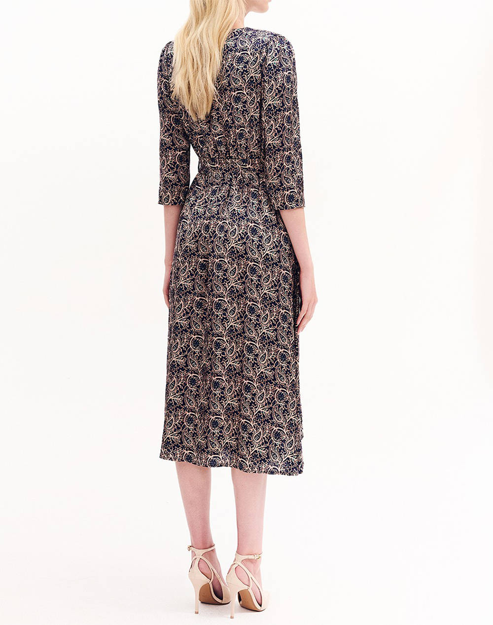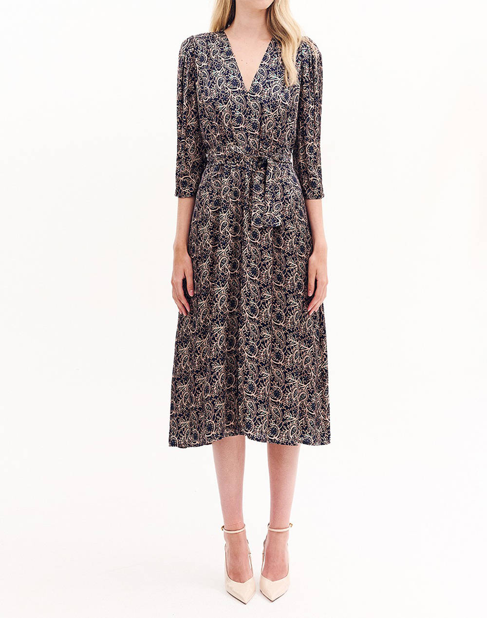 Γυναικείο midi φόρεμα, σε κλος γραμμή, με εμπριμέ μοτίβο. Διαθέτει μανίκια 3/4, με βάτες στους ώμους, "V" λαιμόκοψη, ελαστική μέση με ζώνη/κορδέλα από το ίδιο ύφασμα. (Σύνθεση: 100% Βισκόζη)