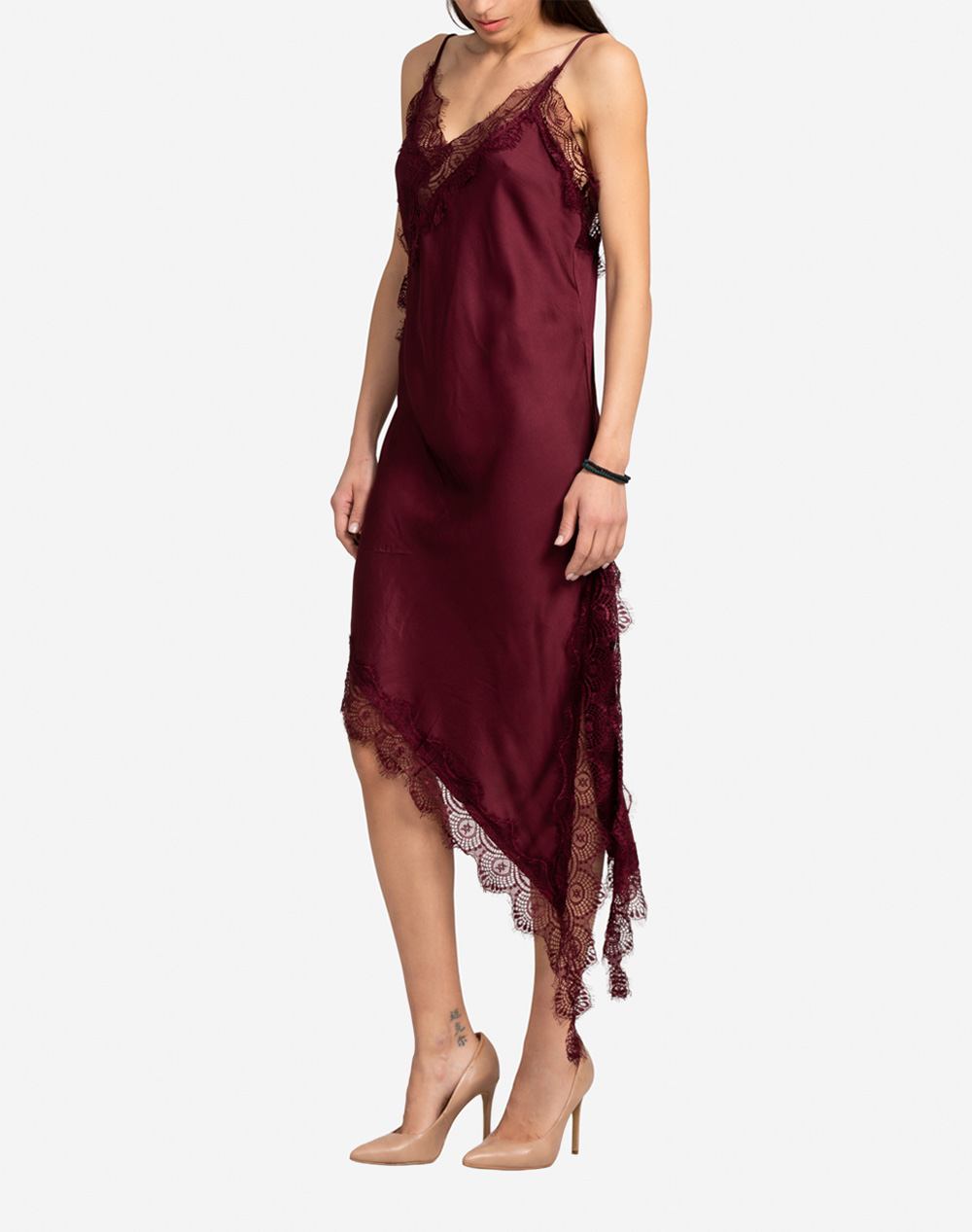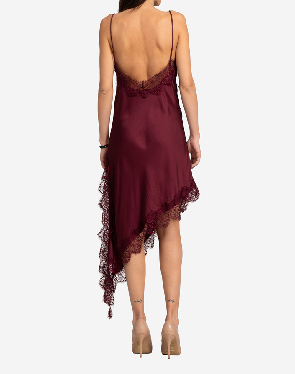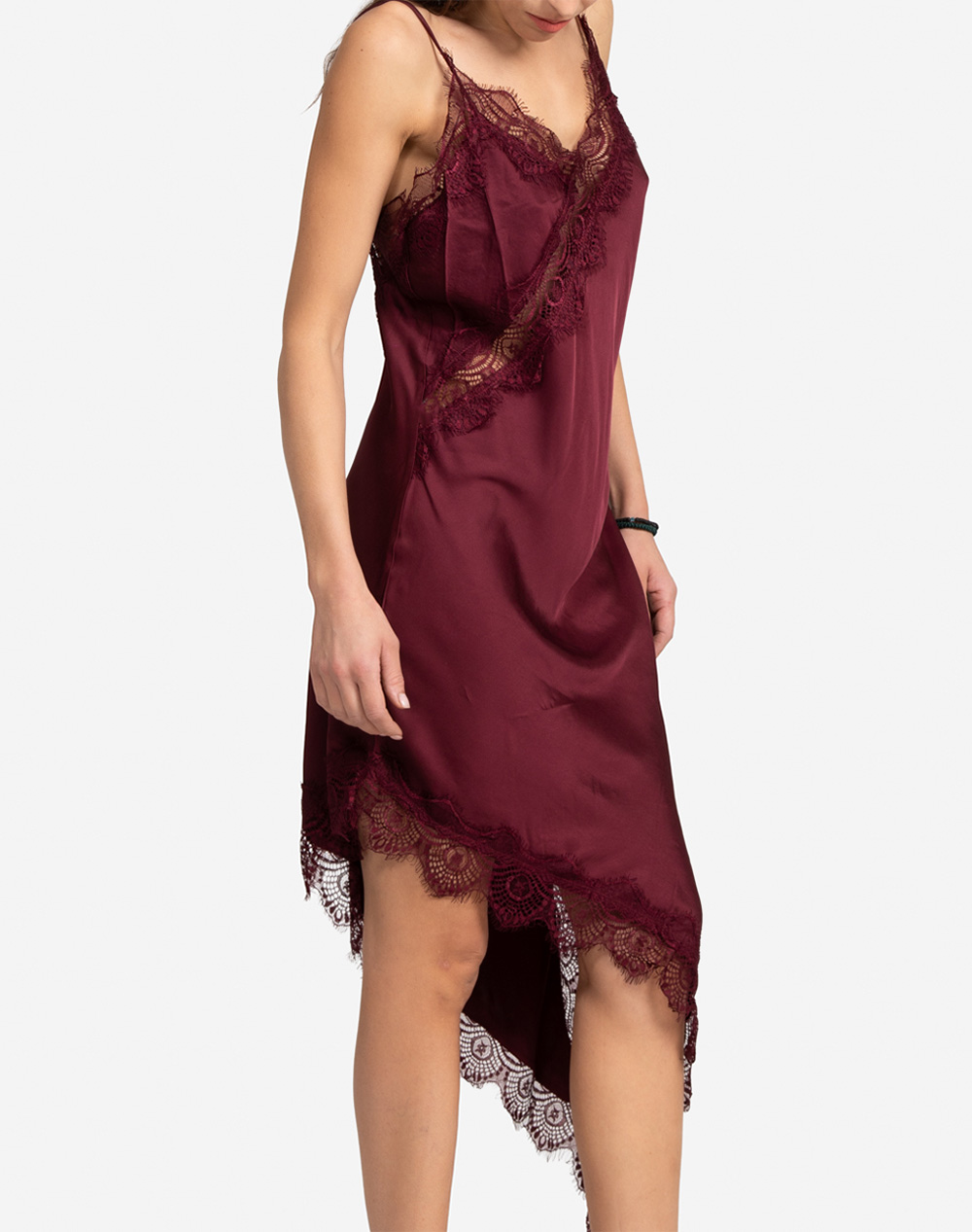 Γυναικείο φόρεμα lingerie, με γυαλιστερή, μεταξένια υφή, ασύμμετρο, με λεπτές τιράντες, ανοιχτή πλάτη και λεπτομέρεις με δαντέλα. Καλύπτει έως 100εκ. περίμετρο στο στήθος. (Σύνθεση: 100% Βισκόζη)