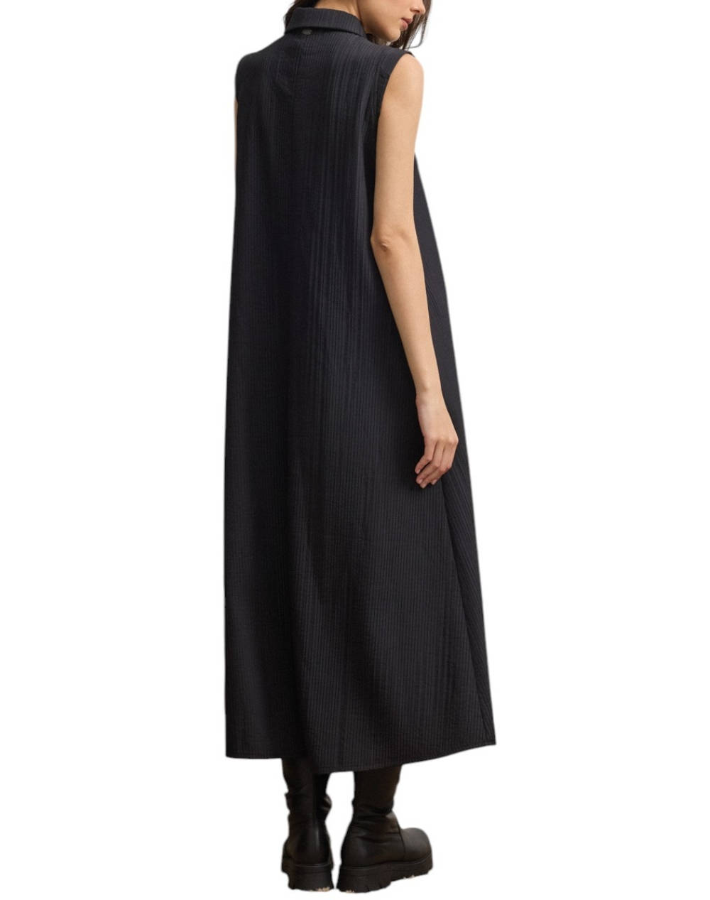 Γυναικείο μίντι φόρεμα, σε χαλαρή Α γραμμή, μονόχρωμο, αμάνικο, με πλισέ ύφασμα και κλασικό γιακά με κουμπιά. (Σύνθεση: 100% Πολυεστέρας)