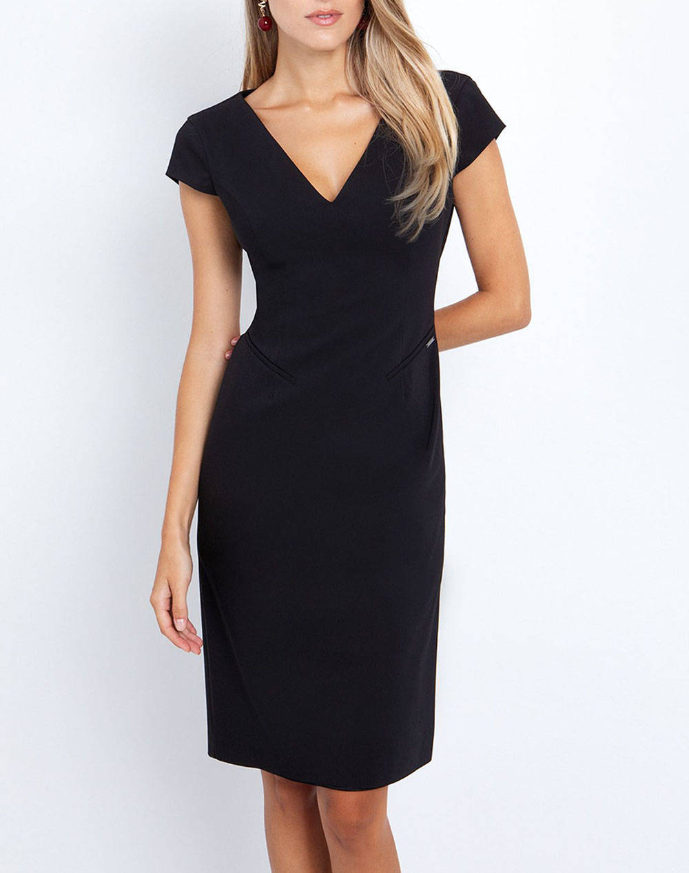 Γυναικείο μίντι φόρεμα, pencil, σε εφαρμοστή γραμμή, κοντομάνικο, με "V" λαιμόκοψη και κλείσιμο στο πίσω μέρος με κρυφό φερμουάρ. (Σύνθεση: 62% Βαμβάκι, 32% Πολυεστέρας, 5% Ελαστάνη)
