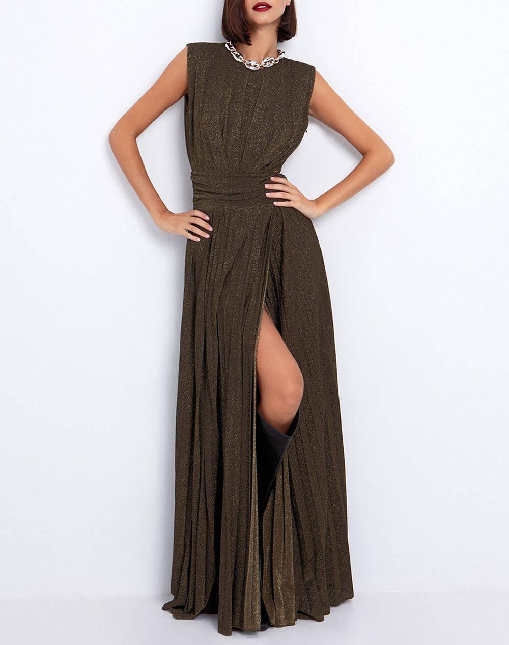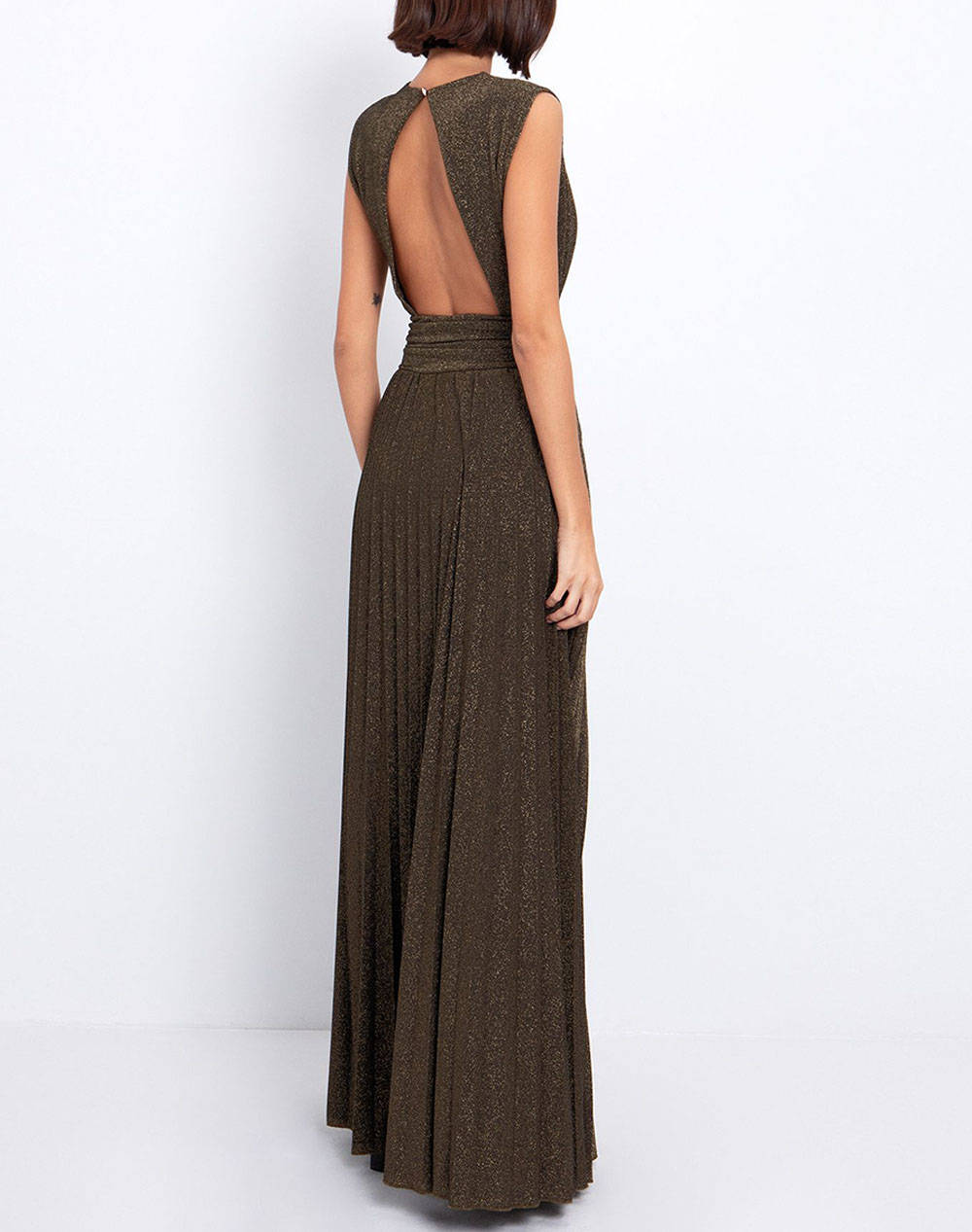 Γυναικείο maxi φόρεμα, αμάνικο, με ντραπέ λεπτομέρειες, ανοιχτή πλάτη και κλείσιμο στο πλάι με κρυφό φερμουάρ.Διαθέτει ενσωματωμένο ασορτί κορμάκι-slip. (Σύνθεση: 45% Πολυεστέρας, 20% Βισκόζη,15% Μεταλλικές ίνες, 15% Πολυαμιδιο, 5% Ελαστάνη)
