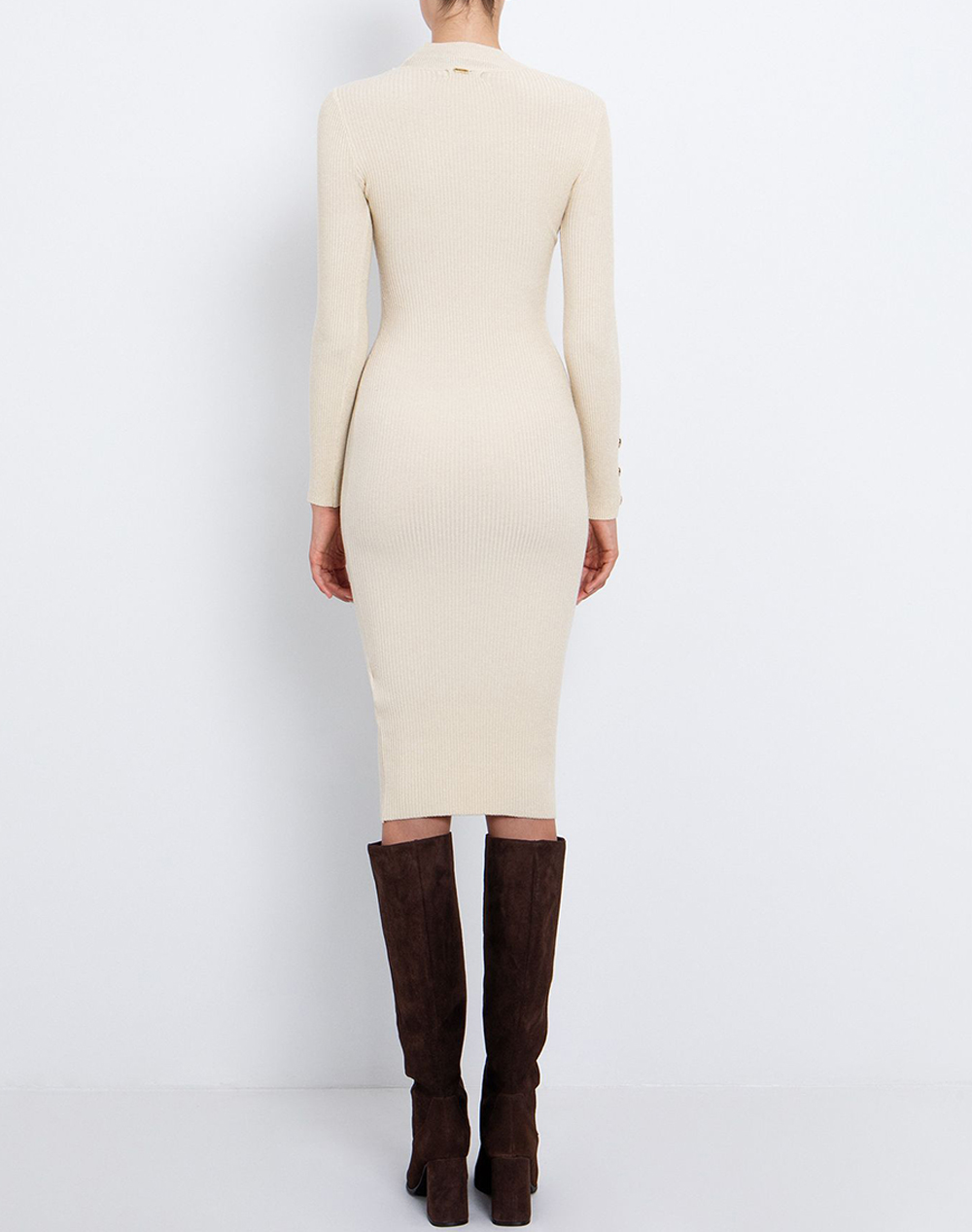 Γυναικείο μίντι φόρεμα, σε εφαρμοστή γραμμή, μονόχρωμο, μακρυμάνικο, με ψηλό λαιμό και μανσέτες με διακοσμητικά κουμπιά. (Σύνθεση: 65% Βισκόζη, 25% Πολυαμίδιο, 10% MTF)