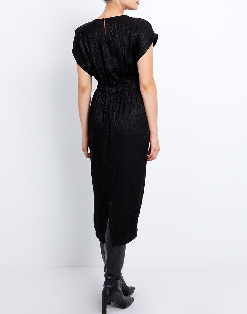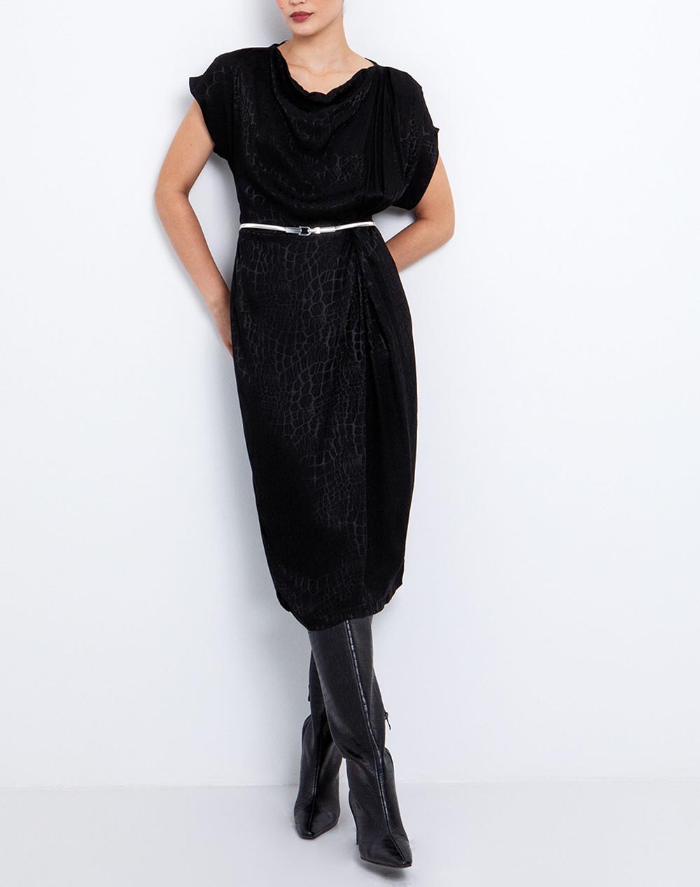 Γυναικείο μίντι φόρεμα, κοντομάνικο, με κροκό μοτίβο, ντραπέ λαιμόκοψη και ελαστικη μέση στο πίσω μέρος. (Σύνθεση: 100% Βισκόζη)