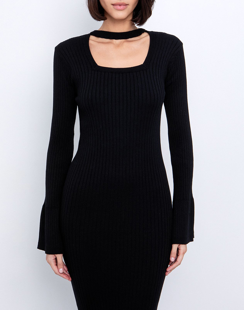Γυναικείο πλεκτό φόρεμα, μίντι, σε εφαρμοστή γραμμή, με εβαζέ μανίκι, τετράγωνη λαιμόκοψη και ριμπ ύφανση. (Σύνθεση: 51% Βισκόζη, 31% Πολυεστέρας, 18% Πολυαμίδιο)