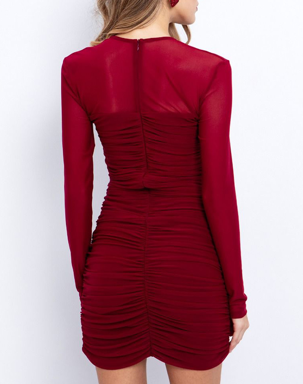 Γυναικείο μίνι φόρεμα, σε εφαρμοστή γραμμή, μακρυμάνικο, με στρογγυλή λαιμόκοψη, λεπτομέρεια με διαφάνεια και κλείσιμο πίσω με φερμουάρ. (Σύνθεση: 90% Πολυαμίδιο, 10% Ελαστάνη)