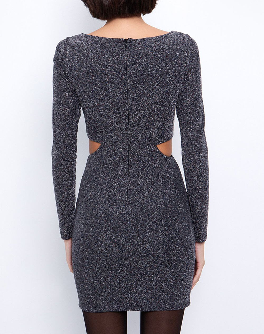 Γυναικείο μίνι φόρεμα, σε εφαρμοστή γραμμή, μακρυμάνικο, με ύφανση με λάμψεις, σχέδιο με κοψίματα στο πλάι και κλείσιμο πίσω με κρυφό φερμουάρ. (Σύνθεση: 62% Πολυαμίδιο, 34% Μεταλλικές Ίνες, 4% Ελαστάνη)