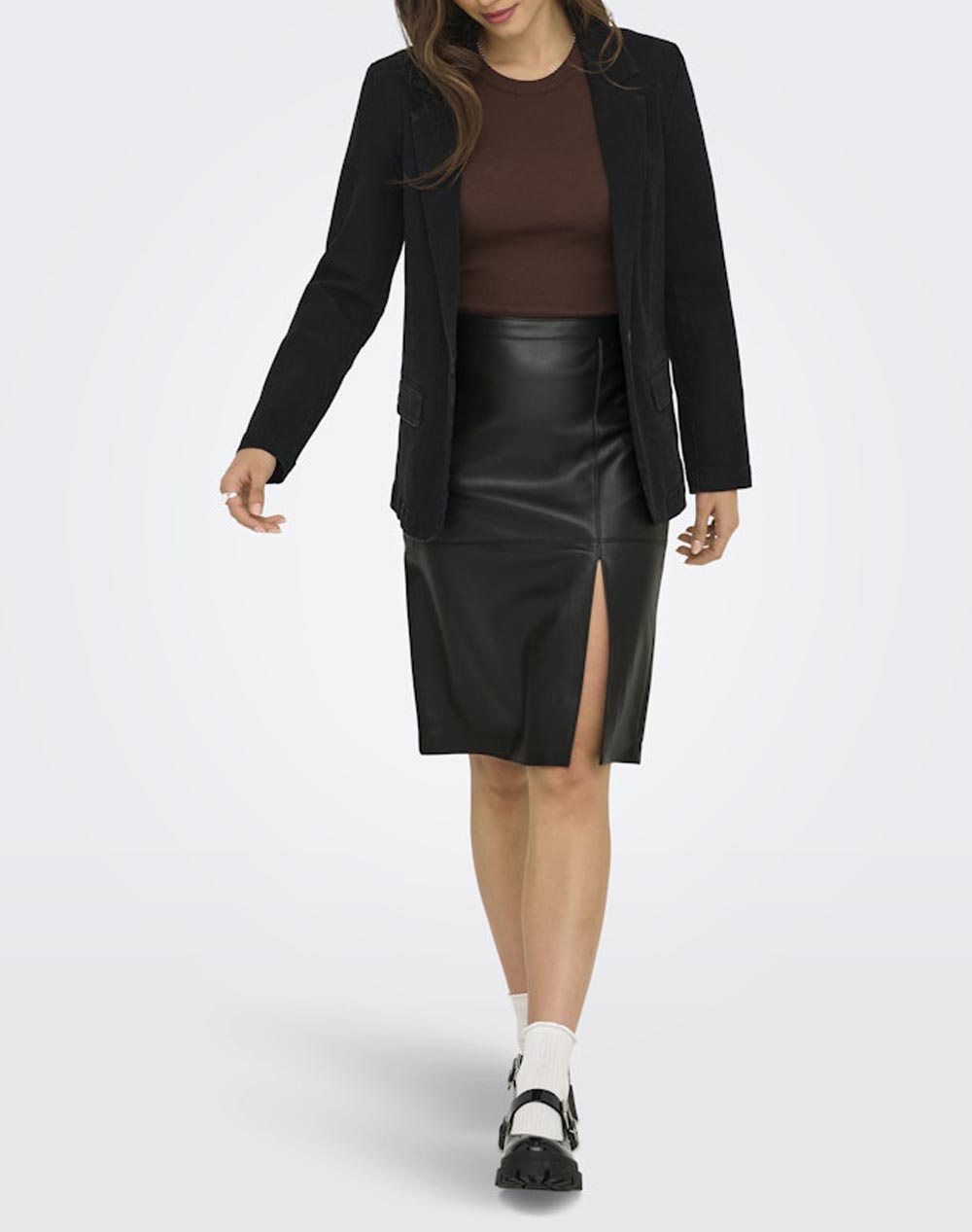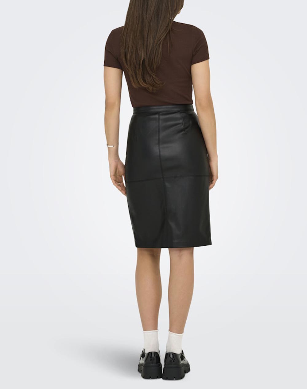 Γυναικεία φούστα, σε κανονική γραμμή, μονόχρωμη, με όψη δέρματος, ραφές και άνοιγμα στο πλάι. (Σύνθεση: 100% Πολυεστέρας - επικαλυμμένο με πολυουρεθάνη)