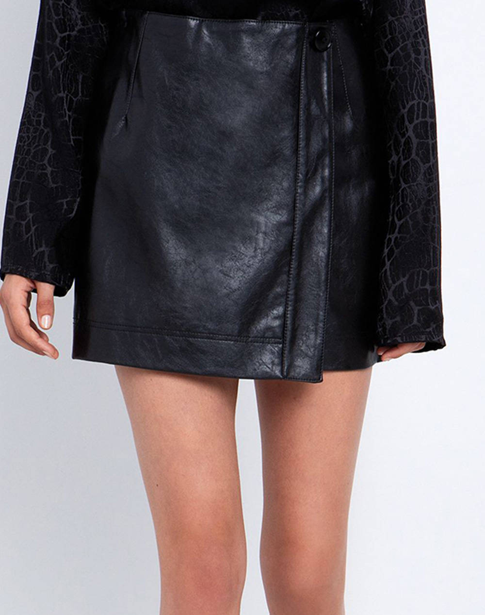 Γυναικεία φούστα/σόρτς, σε κανονική γραμή, ψηλόμεση, με δερματίνη σε εφέ τσαλακωμένης όψης, κλείσιμο με κουμπί μπροστά και φερμουάρ στο πλάι.(Σύνθεση: 65% Πολυουρεθάνη, 35% Βισκόζη)