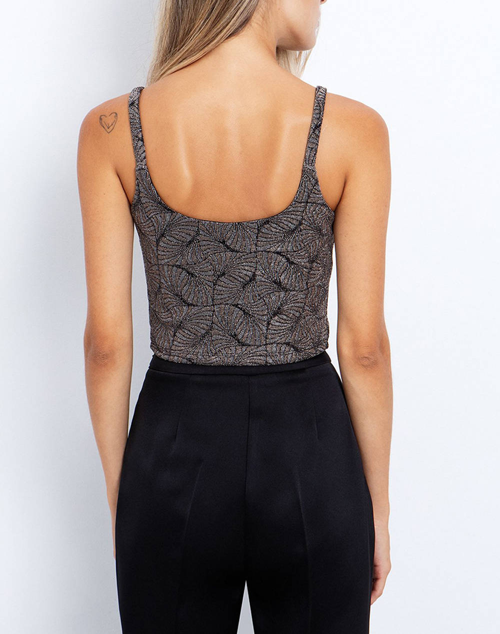 Γυναικείο τοπ, σε κοντό μήκος, με εφαρμοστή γραμμή, εμπριμέ μοτίβο, τιραντες με απλικέ μαύρα κρύσταλλα και στρογγυλή λαιμόκοψη. (Σύνθεση: 73% Πολυαμίδιο, 22% Μεταλλικές ίνες, 5% Ελαστάνη)