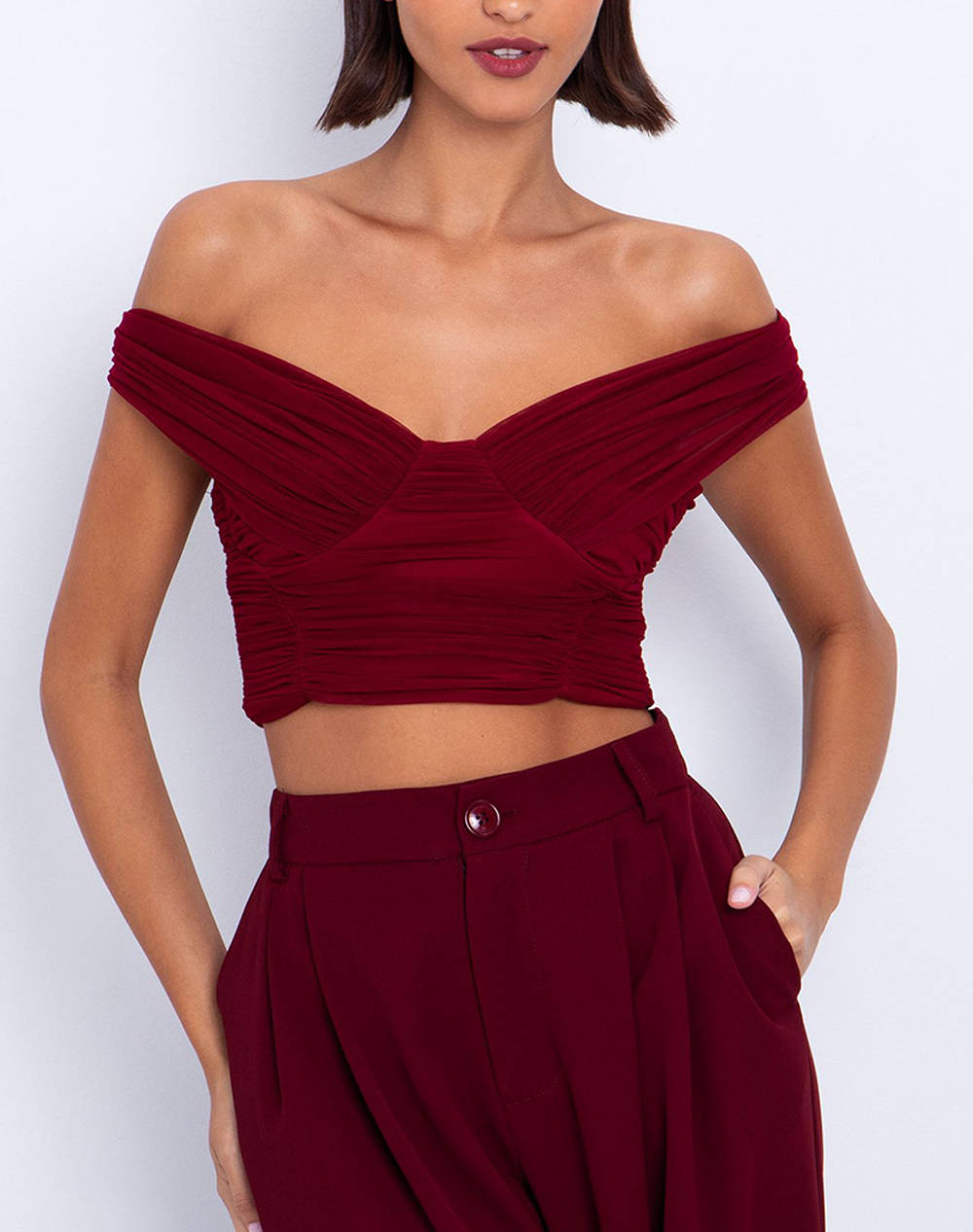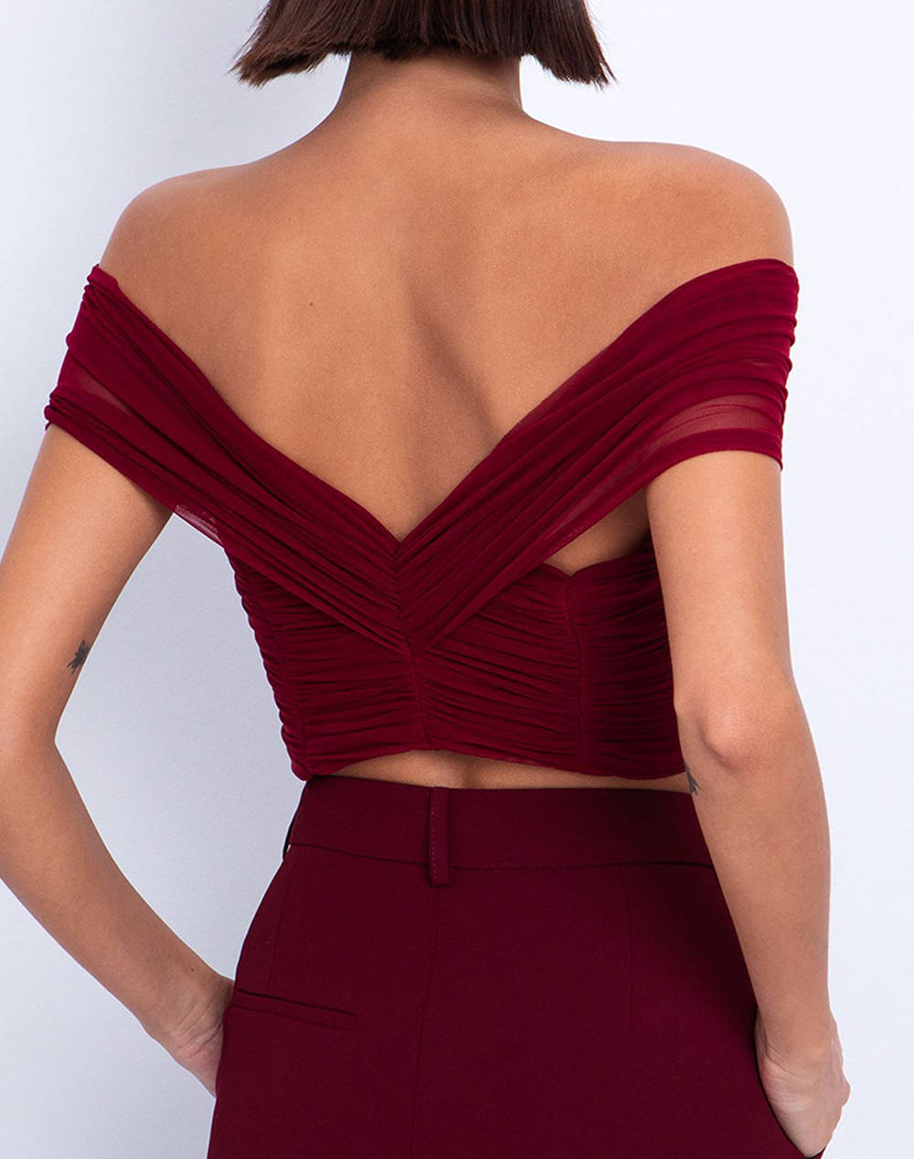 Γυναικείο tulle crop τοπ, σε κανονική γραμμή, μονόχρωμο, με ακάλυπτους ώμους και κλείσιμο στην πλάτη με φερμουάρ. (Σύνθεση: 92% Πολυαμίδιο, 8% Ελαστάνη)