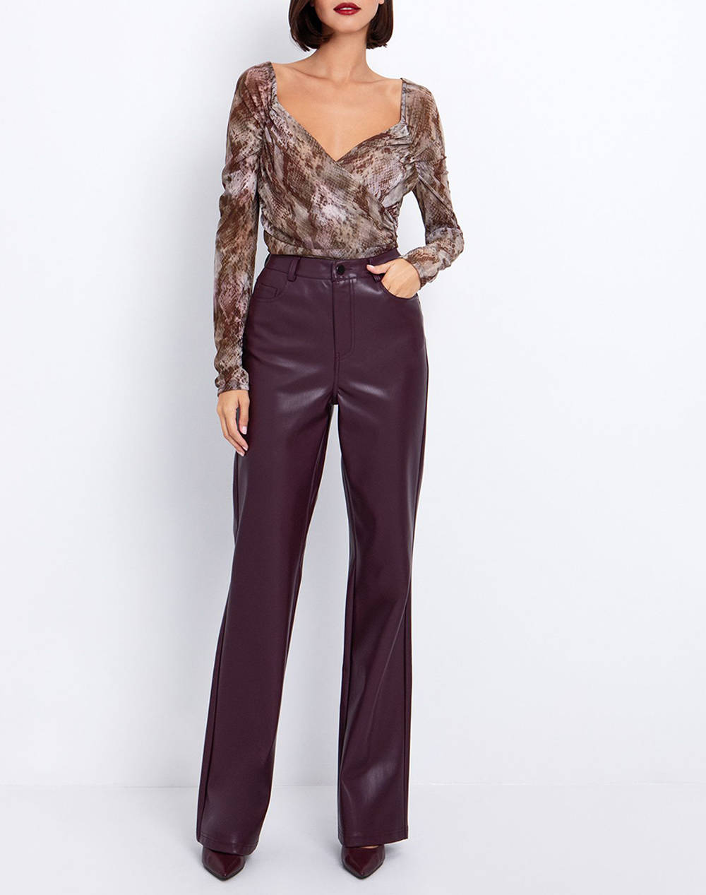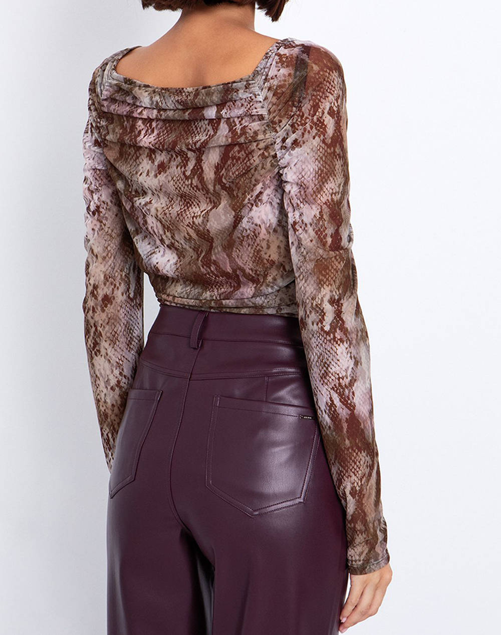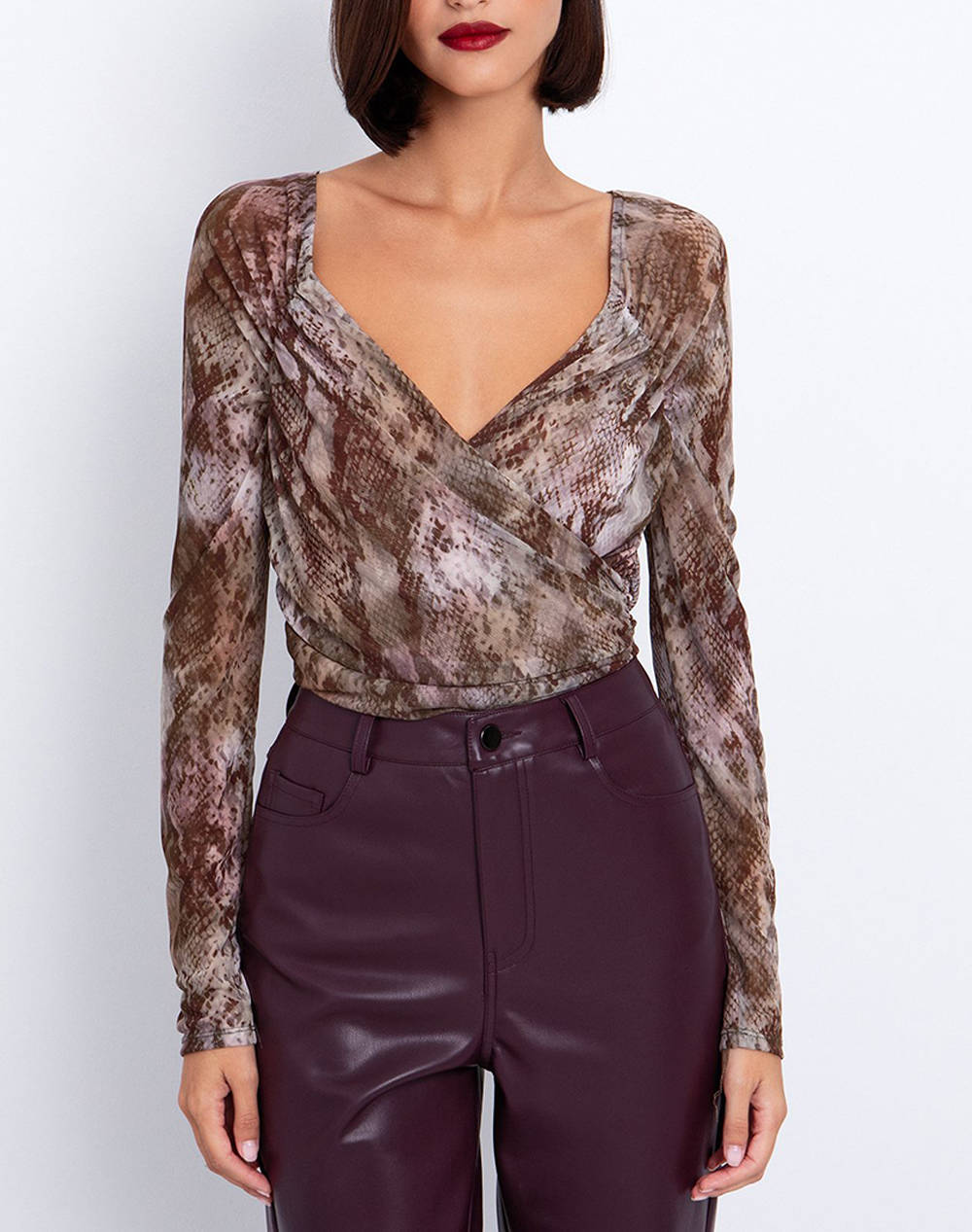 Γυναικεία μπλούζα, σε κανονική γραμμή, μακρυμάνικη, με all over snake print, ντραπέ λεπτομέρειες στην πλάτη και σταυρωτό V ντεκολτέ. (Σύνθεση: 92% Πολυεστέρας, 8% Ελαστάνη)