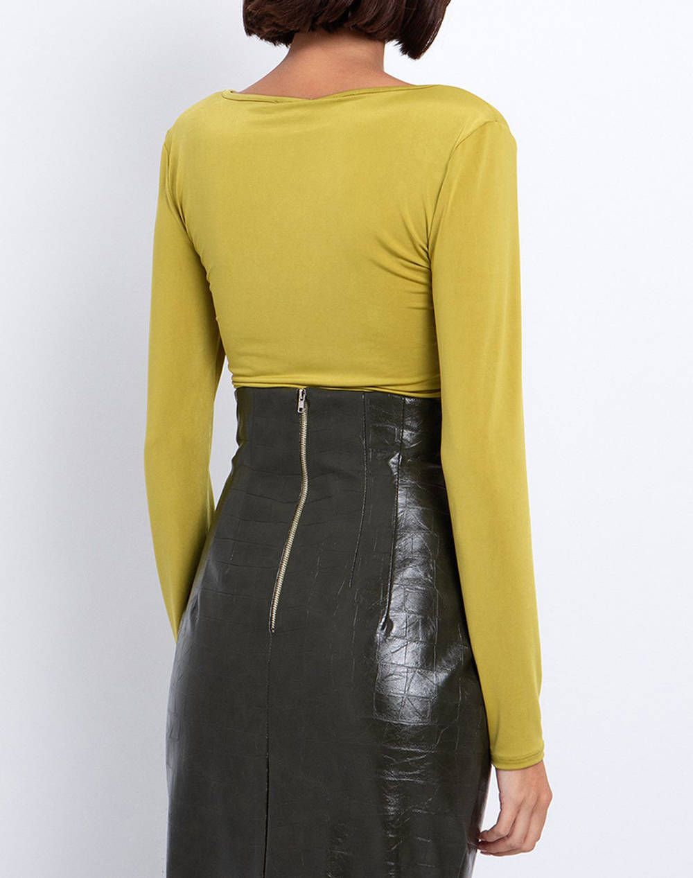 Γυναικεία μπλούζα, σε στενή γραμμή, μακρυμάνικη, μονόχρωμη, με "V" ντεκολτέ με διακοσμητικό ασύμμετρο κρίκο και cut out λεπτομέρεια. (Σύνθεση: 94% Πολυεστέρας, 6% Ελαστάνη)