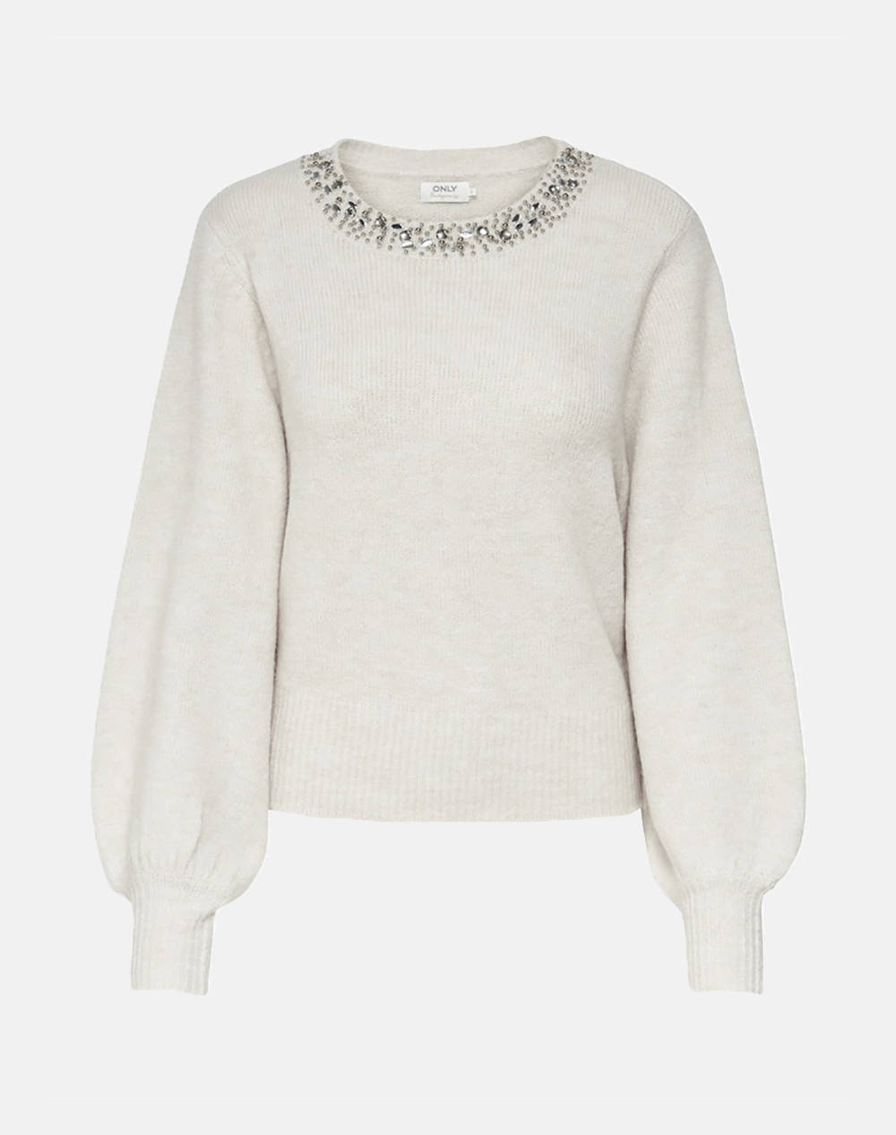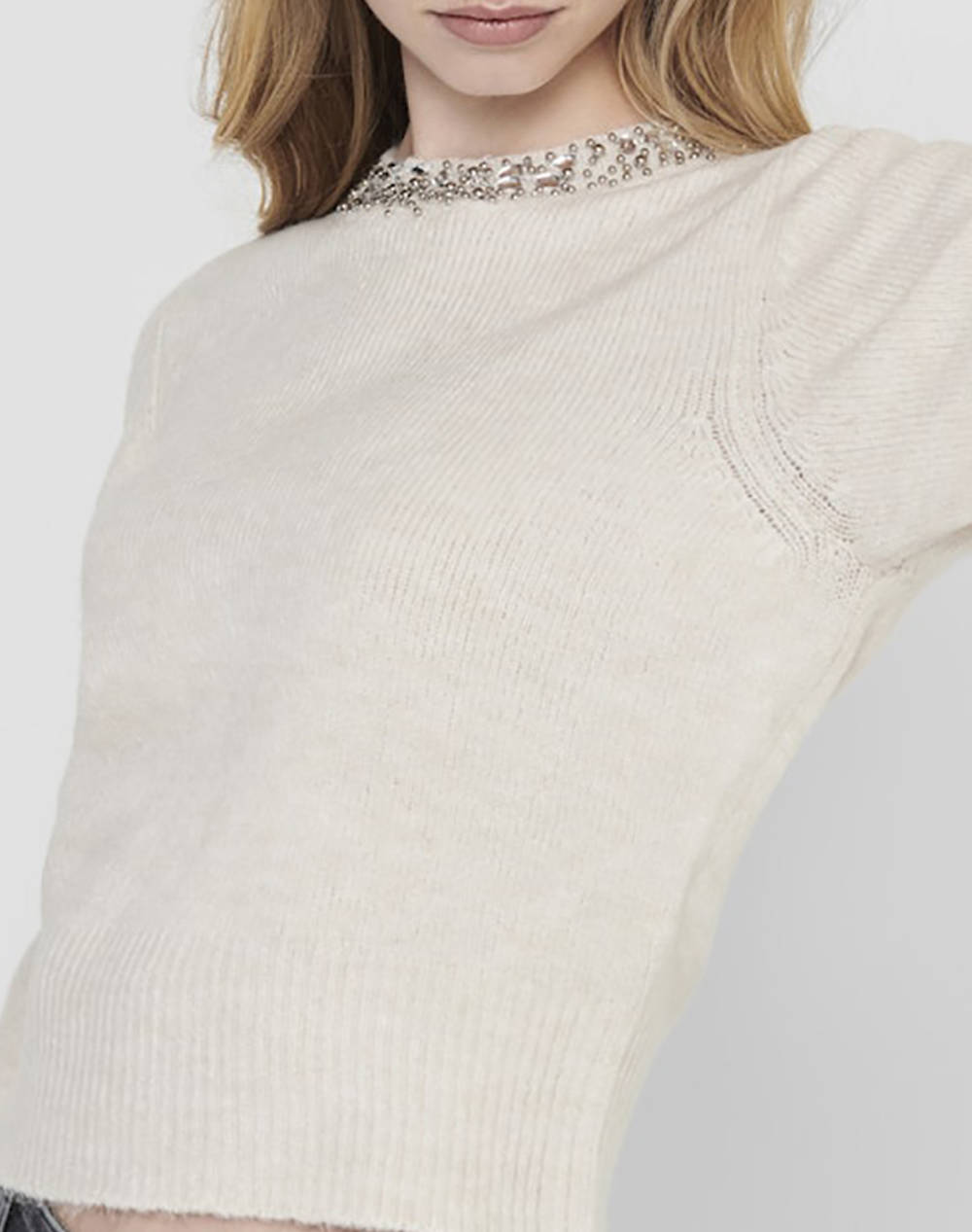 Γυναικεία πλεκτή μπλούζα, σε κανονική γραμμή, μονόχρωμη, μακρυμάνικη, με στρογγυλή λαιμόκοψη και διακοσμητικά στράς. (Σύνθεση: 70% Ακρυλικό, 28% Πολυεστέρας, 2% Ελαστάνη)