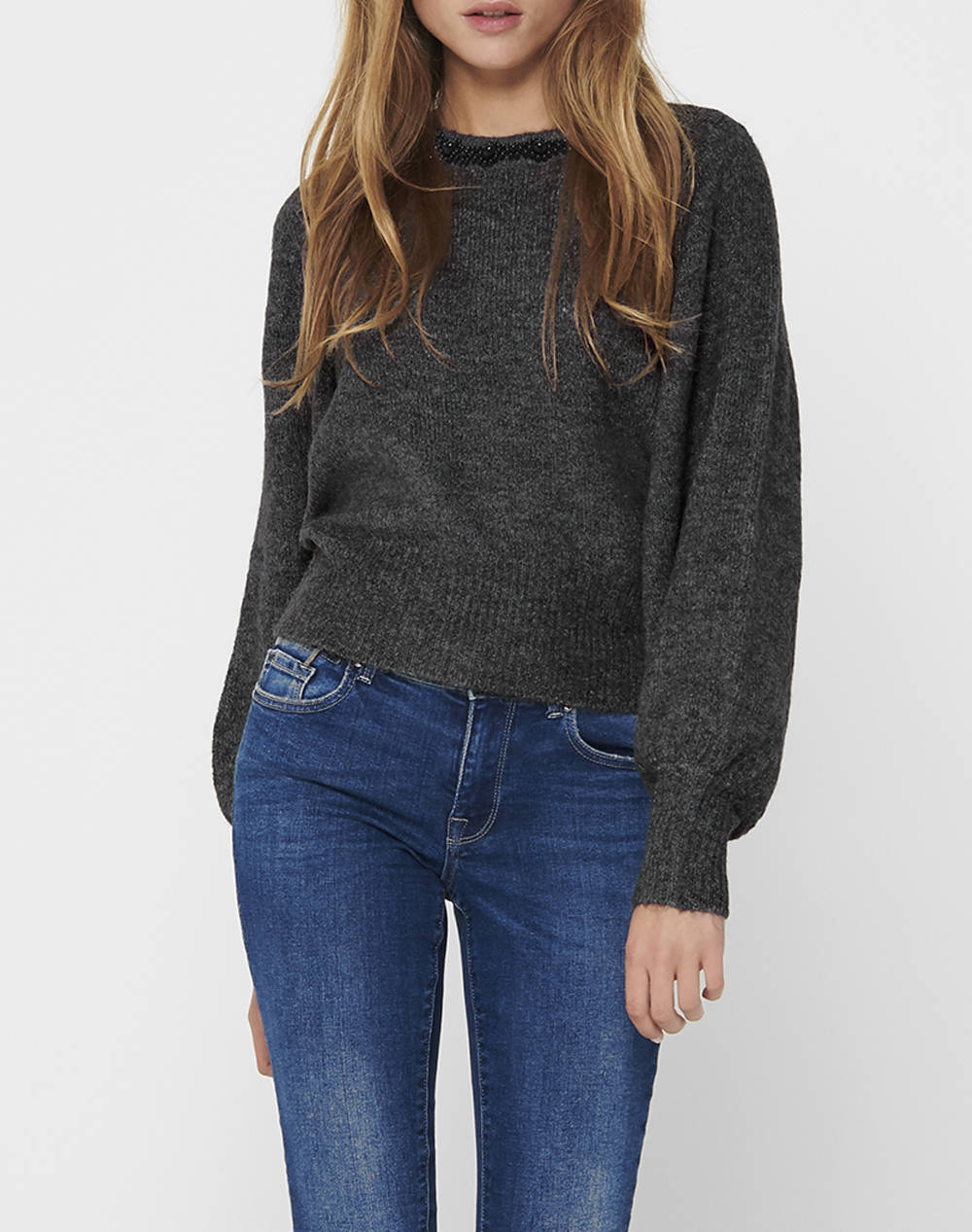 Γυναικεία πλεκτή μπλούζα, σε κανονική γραμμή, μονόχρωμη, μακρυμάνικη, με στρογγυλή λαιμόκοψη και διακοσμητικά στράς. (Σύνθεση: 70% Ακρυλικό, 28% Πολυεστέρας, 2% Ελαστάνη)