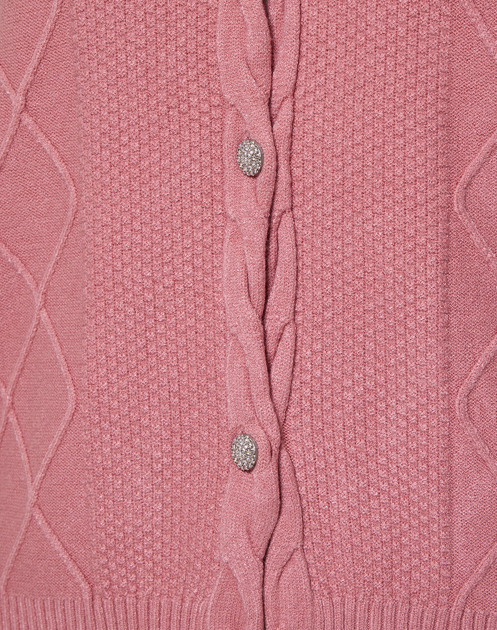 Γυναικεία πλεκτή ζακέτα, μακρυμάνικη, με ανάγλυφη πλέξη, "V" λαιμόκοψη και κλείσιμο με strass κουμπιά. (Σύνθεση: 49% Βισκόζη, 28% Πολυεστέρας, 23% Νάιλον)