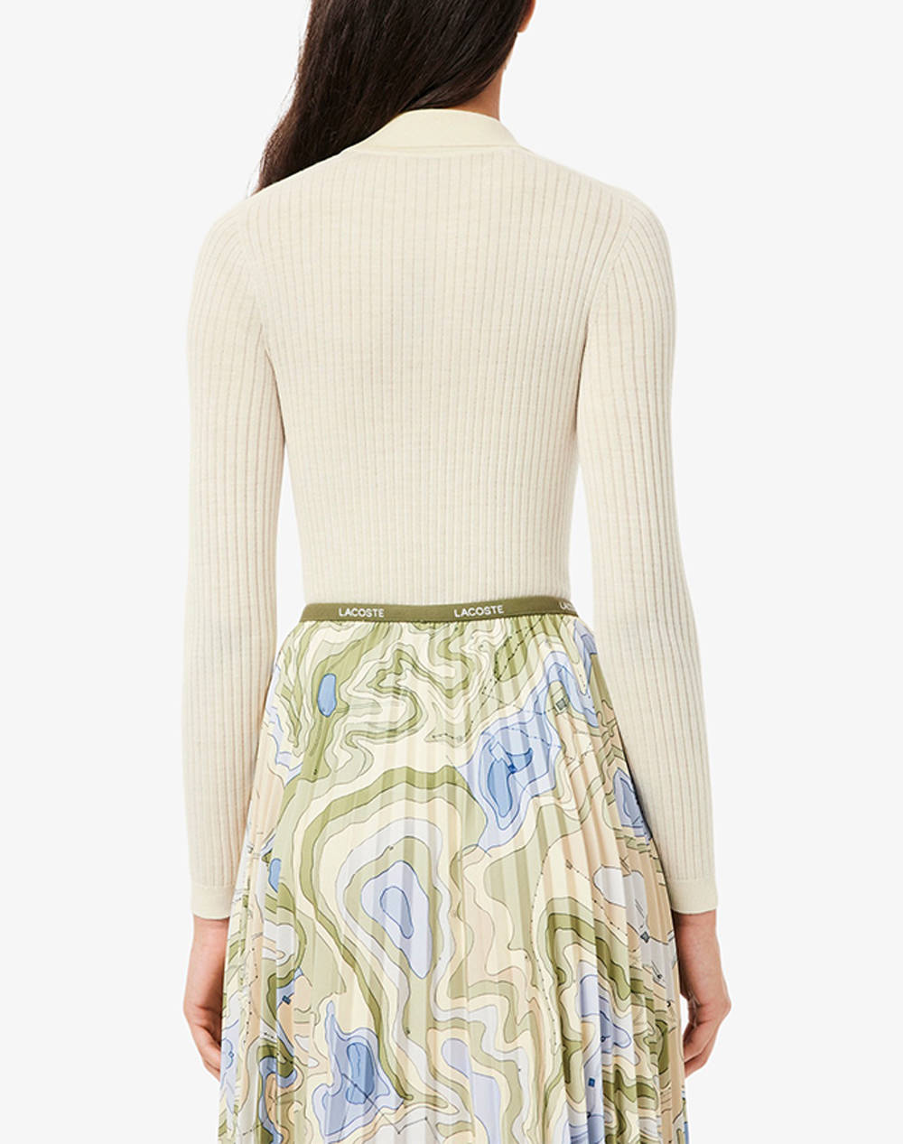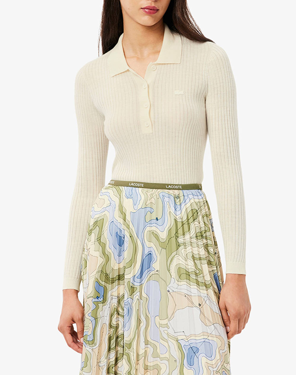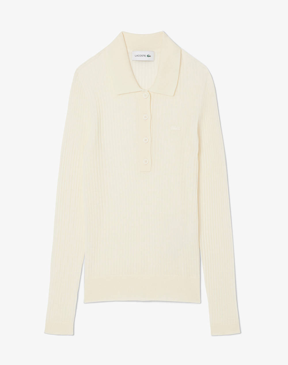 Γυναικείο πουλόβερ, σε εφαρμοστή γραμμή, μακρυμάνικο, με γιακά σε στυλ polo και τονικά κουμπιά στη λαιμόκοψη. (Σύνθεση: 100% Μαλλί)